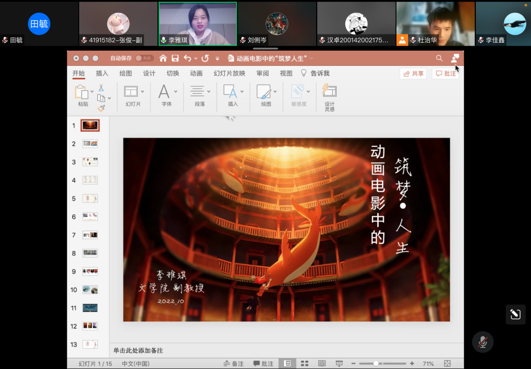 10月14日晚,本学期第2期(总第304期)文心阁师生面对面交流活动在线上顺利举办,beat365副教授、文艺学教研室的李雅琪老师应邀参加,以“动画电影的‘筑梦人生’”为主题,和同学们进行交流探讨。