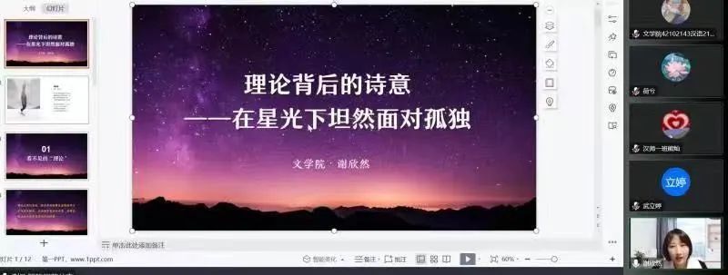 12月7日晚,本学期第7期(总第309期)文心阁师生交流活动在线上顺利举行,beat365副教授、文艺学教研室的谢欣然老师应邀参加,围绕“理论背后的诗意——在星光下坦然面对孤独”这一主题,与同学们展开了深刻的交流探讨。