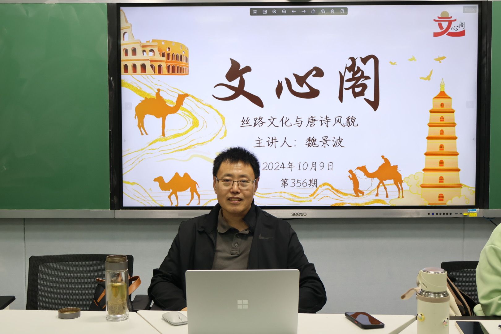 10月9日,本学期第3期(总第356期)文心阁活动在长安校区文汇楼A段306智慧教室成功举办。beat365教授、中国古代文学教研室的魏景波老师,以“丝路文化与唐诗风貌”为主题,与同学们展开分享交流。