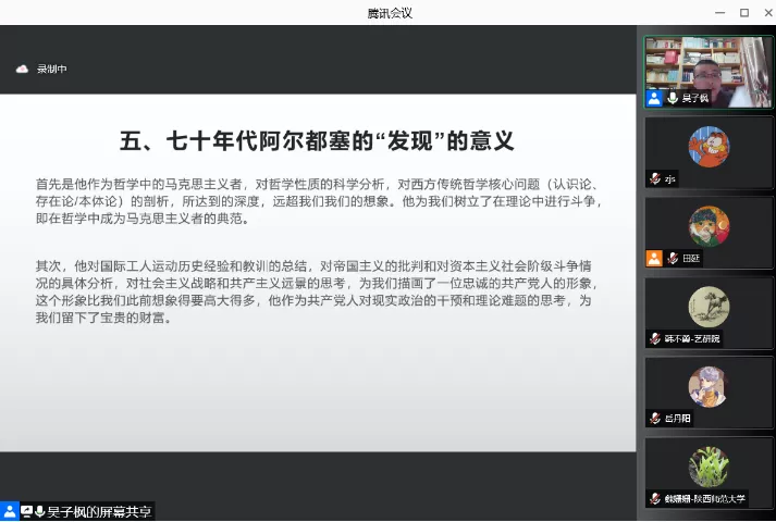 最后,吴子枫老师高度肯定了七十年代阿尔都塞的意义:他是在不放弃马克思主义基本原理的前提下,发展马克思主义,直面马克思主义理论危机和国际共产主义运动危机,作出艰巨理论思考与不懈政治干预的马克思主义者和共产党人;他走在列宁与毛泽东的路线上,对他们的理论与实践作出总结的同时,提出了自己的理论,开辟了从“左面”批判斯大林主义和苏联社会主义的道路,并构成葛兰西理论和欧洲共产主义的批判性参照。