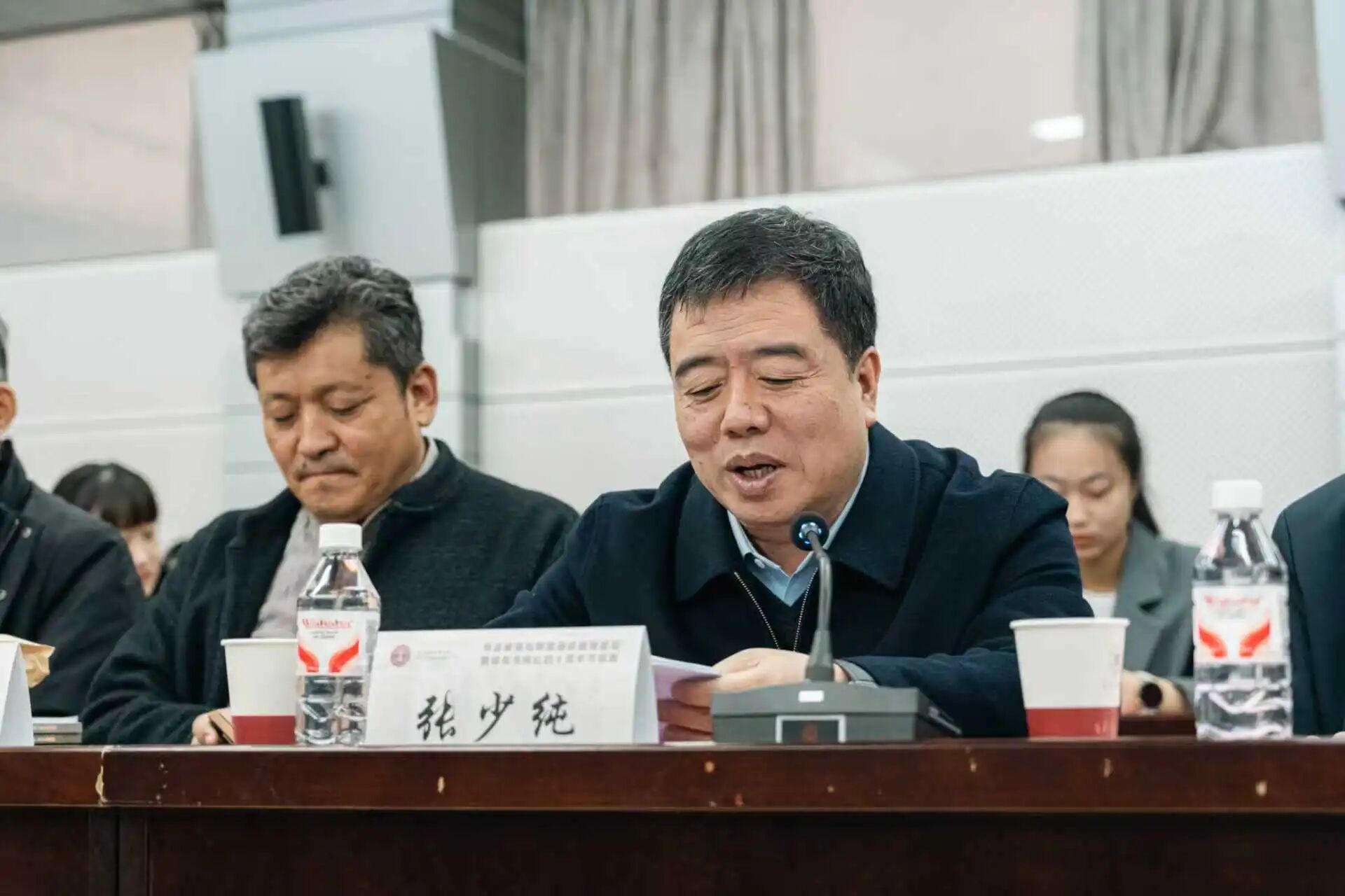 嘉宾代表、西安市委社会工作部部长、84级员工张少纯致辞。他回顾了砚友书画社的发展历程,并结合个人学习书法的经历与体会,强调书法学习要重视继承,保持定力,在经典的反复临摹中沉淀,克服浮躁,真正领会传统的精髓。