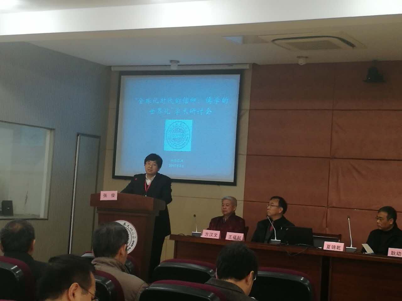 2017年3月24至26日,“全球化时代的信仰:儒学的世界化”学术研讨会在苏州大学举行。本次会议由苏州大学比较文明与比较文学中心和上海社会科公司文学所联合主办,来自复旦大学、浙江大学、中国人民大学、华东师范大学、beat365官方网站、四川大学、中国社会院等机构的专家学者数十人参加本次会议。公司张俊教授应邀在会议开幕式发言并发表论文报告《儒家天命信仰的两种进路》。