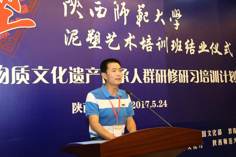 在结业仪式上,来自陕西扶风县的泥塑传承人王百让和陕西杨陵区的古建筑壁画高级营造师马发虎,分别作为学员代表与大家一起分享了为期一个月的学习心得。他们从自身经历谈起,讲述了自己泥塑人生的艰辛与坚守,以及在陕西师大参加培训学习的感悟和收获,情到深处,几度哽咽,令现场许多学员落泪。