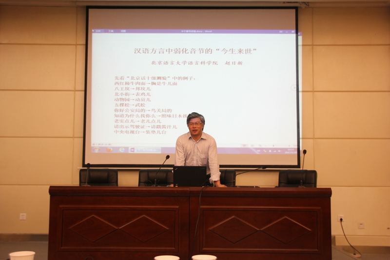 晚上7时许,报告正式开始。赵日新教授从王洪君先生提出的弱化合音规律中的“半个音节”(或称弱化音节)问题着眼,引用大量文献及方言材料,从历时和共时两个角度对这一问题进行了详细的阐述与分析。
