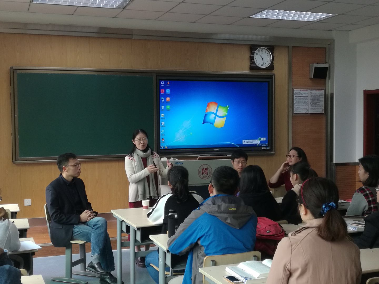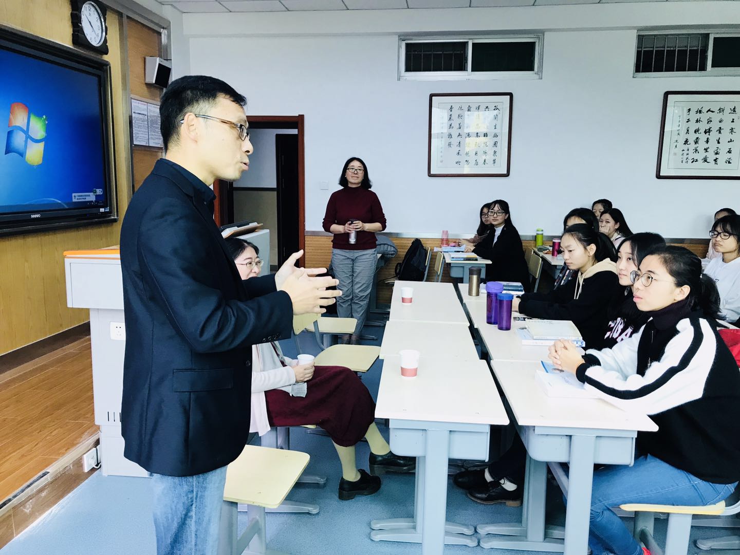 随后,同济大学三位教师来到2016级汉语卓越教师班的课堂,以“文学教育与人的培养”为题展开了对话式教学。在这一次课堂实践中,同济大学的老师们结合各自的专业背景和文学创作、批评以及理论研讨的经验,精彩地传达了对文学教育和人的培养这一问题的理解。现场师生均表示开阔了视野,得到了激励,并决心以更大的决心投入专业课的学习,为实现人生理想而更加努力。