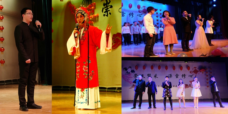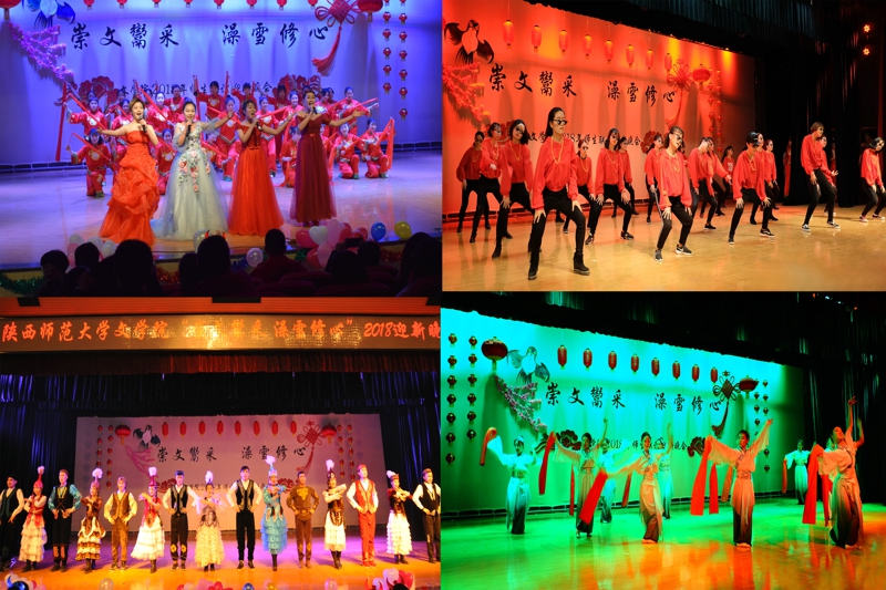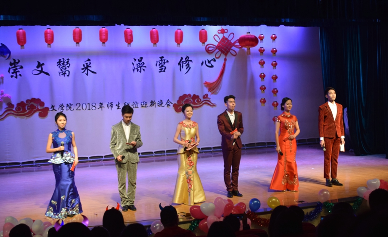 曲动魄,舞飘飖,铿锵有力的鼓点和鲜艳灵动的红绸喜庆祥和,歌舞节目《好运来》拉开了迎新晚会的序幕。《春知晓梦》、《舞乐春秋》为观众带来了美的享受,旗袍水袖,婉约柔美,一颦一笑,动人心弦; 2015级员工呈现的舞蹈《全部都是你》则充满着惊喜和欢笑,师生互动,掌声不断,且歌且舞,活力四射。文苑社团联合展示的《将进酒》和17级新生带来的原创诗歌朗诵《青灯》,用抑扬顿挫的诗句吟诵出学子的深厚底蕴,用悠扬婉转的曲调歌唱出文苑的赤子深情。字里行间、饱含赞美,文辞断句、潜隐祝福。由辅导员秦亚坤老师和研究生代表表演的戏曲联唱古风古韵,唱腔细腻,别具风味;小品《你好,李焕英》、《家长会》则着眼于社会热点问题,触觉敏锐新颖,情感充沛自然,嬉笑怒骂,戏说人生。研究生同学们带来的节目《青春组歌》旋律曼妙,嗓音迷人,诉尽柔情,展现出学子们积极向上的靓丽风采。《天下相亲与相爱》在员工会与研究生会主席团动感的舞蹈中开场,学工组的老师们依次上台一展歌喉,掀起全场高潮。