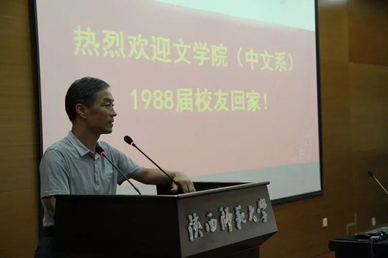 在此之后,四位1988届员工代表上台发言。“感谢”与“祝愿”是他们共同的主题,“回忆”与“怀念”是他们不变的旋律。 他们感谢老师呕心沥血的培养和孜孜不倦的教诲;他们感谢师大优良的学习环境和扎实严谨的学风;他们感谢时代给与的精神文化的幸福感。他们也许下祝愿。祝愿母校发展振兴、祝愿老师长寿安康、祝愿同学平安幸福。他们说:“不管我走到哪里,不管做什么工作,师大中文系,始终是我的根,始终牵着我的魂。”