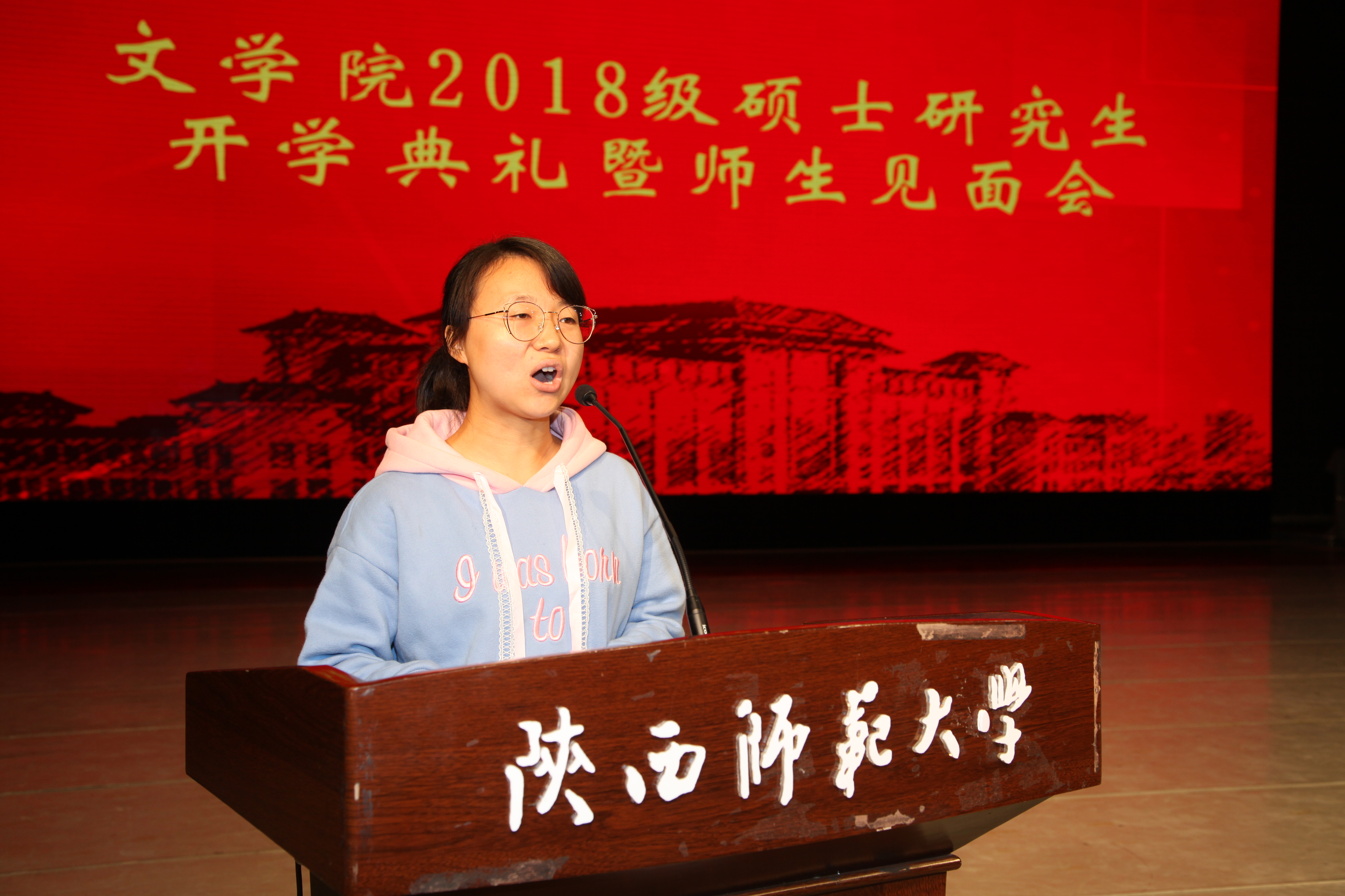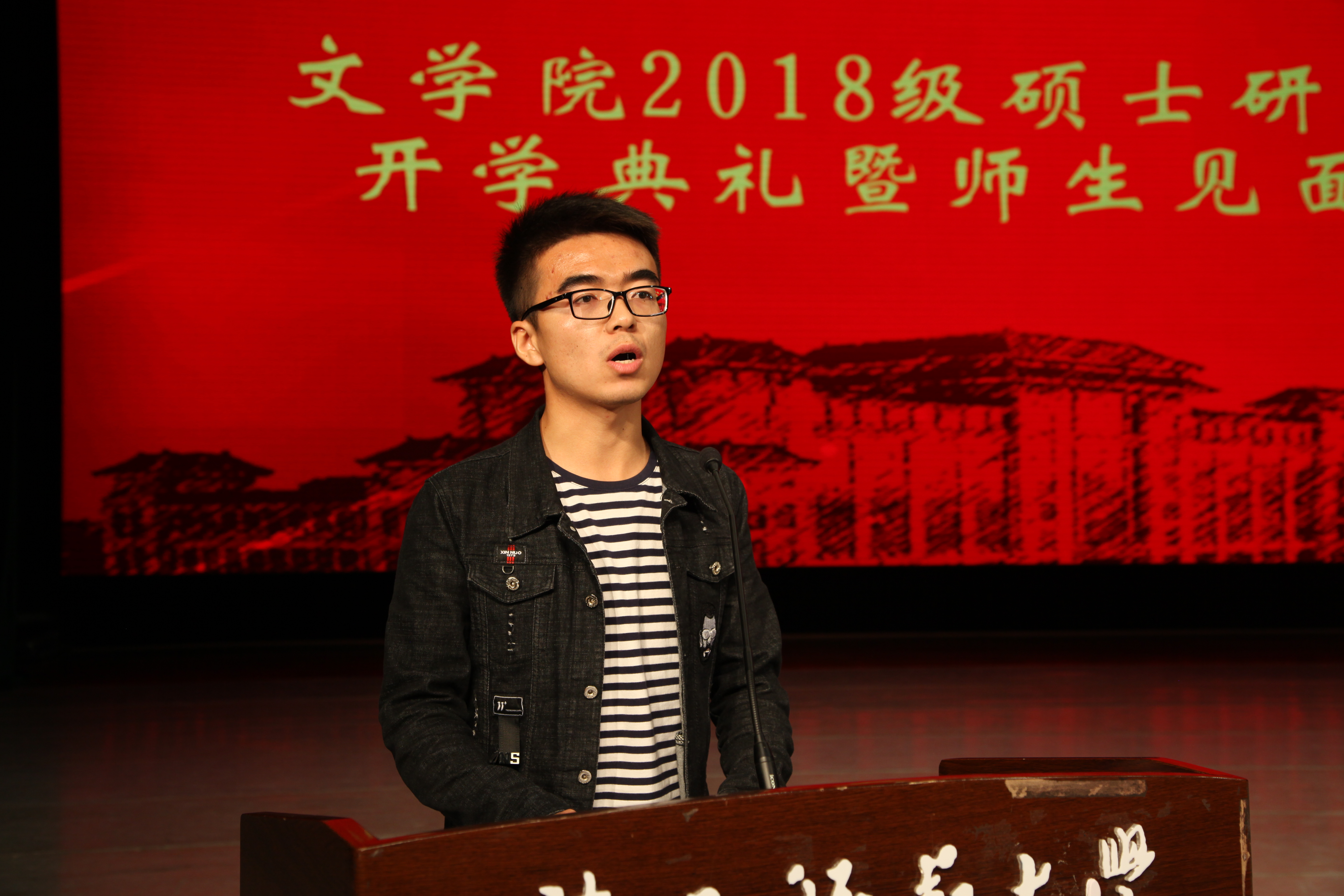 接下来,在读优秀硕士生代表任杰发言。他以自己的亲身经历为例,告诉同学们要保持对文学的热情,保留热爱文学的纯真,并建议同学们要多运动,有意识地接近、欣赏艺术。紧接着,2018级新生代表张芸倩与同学们交流,她以“世界这么大,我想去看看”为引,讲述了自己追逐文学梦想的道路。
