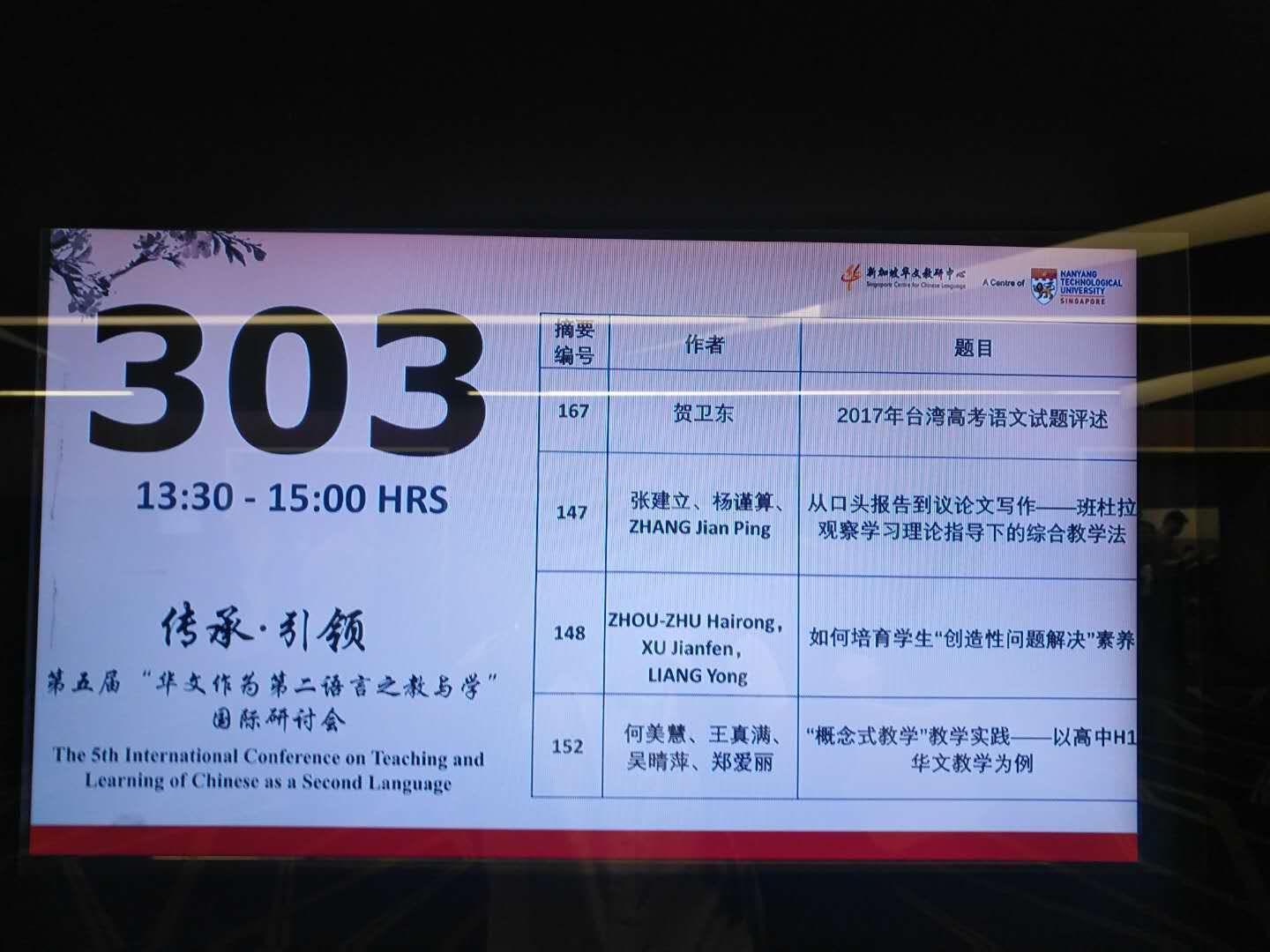 第五届“华文作为第二语言之教与学”国际研讨会由新加坡教育部主办,新加坡华文教研中心承办。该论坛在世界华语圈有着广泛的影响。本次大会有1000多名来自世界各地的参会者,大会主题是“传承·引领”。大会开幕式上新加坡教育部长王乙康先生致辞。来自剑桥大学、哈佛大学、香港中文大学、新加坡南洋理工大学等大学的5位专家做了关于华文教育意义与未来发展的主宾发言。大会还进行了为期一天半的分论坛讲座。贺卫东老师主持了分论坛,并在分论坛上对自己的论文《2017年台湾高考命题评述》进行了演讲。演讲深受与会者好评,会后诸多学者与贺老师进行了深入的交流,并希望能够在更大更高层面上的交往。