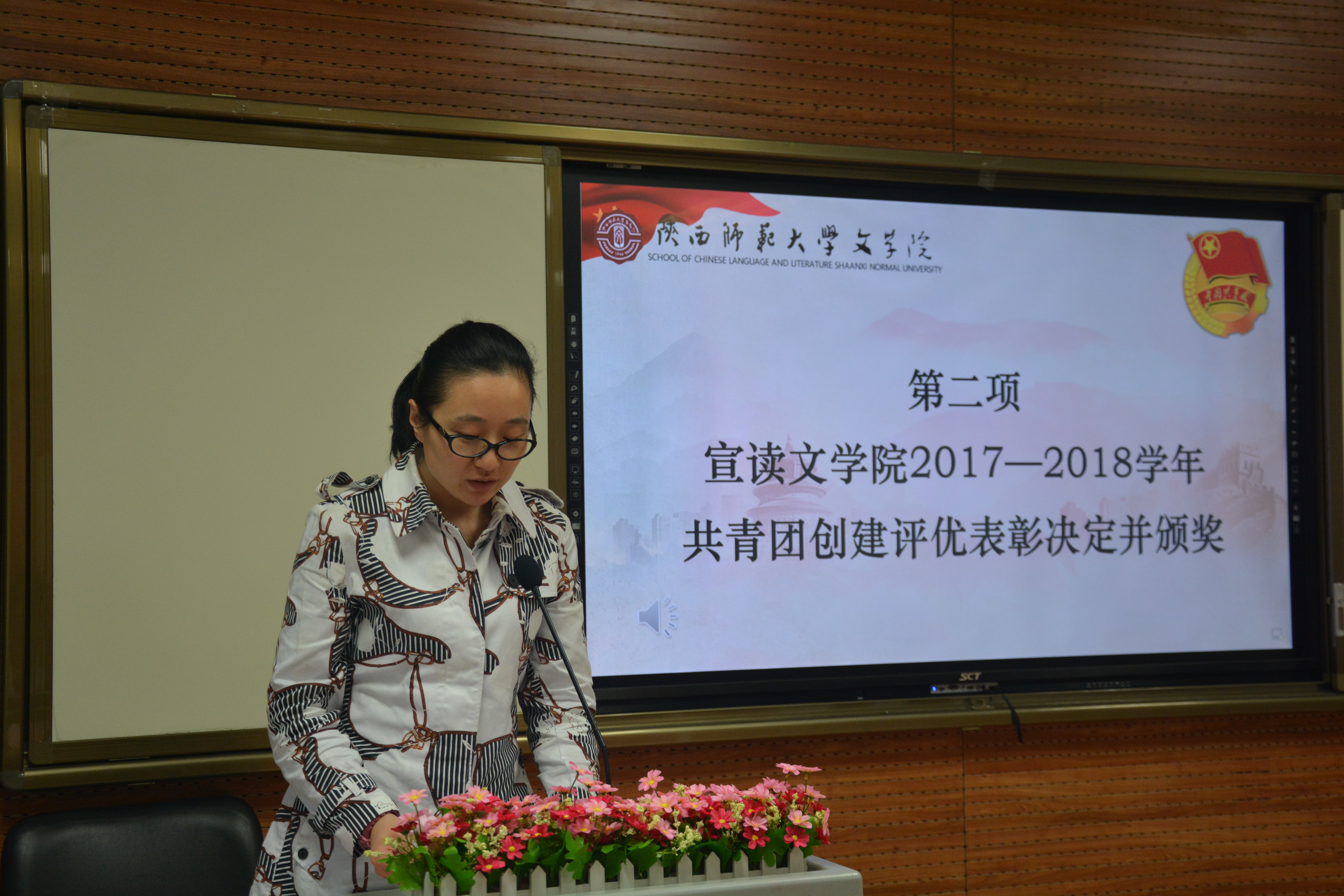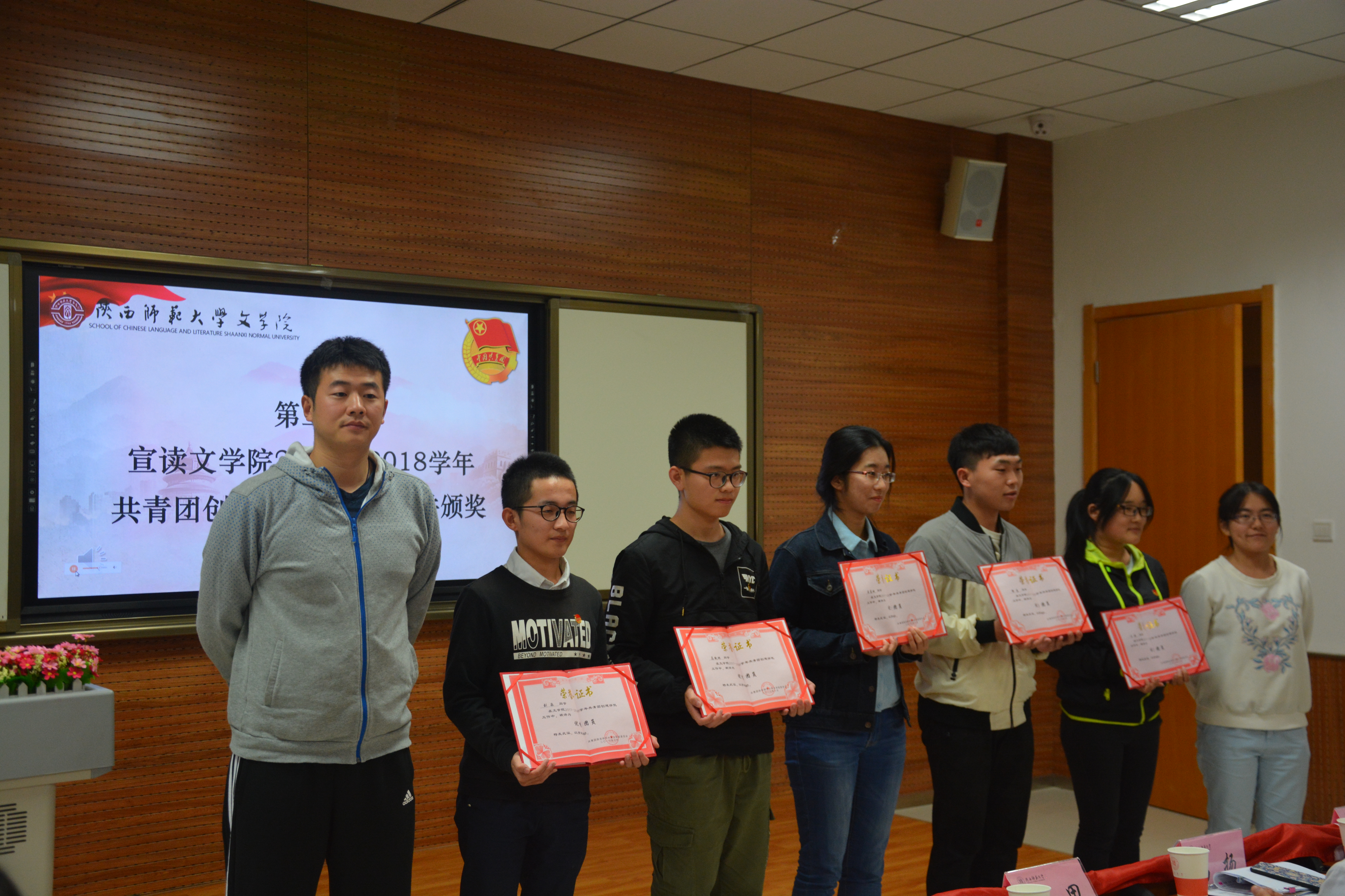 仪式在全体师生整齐嘹亮的团歌声中拉开帷幕。辛田老师宣读公司2017—2018学年共青团创建评优表彰决定。与会老师为2016级汉语国际教育团支部等5个五四红旗优秀团支部、张鹏等5名优秀团支书、周倩等5名优秀团干部、刘淼等5名优秀团员颁奖。