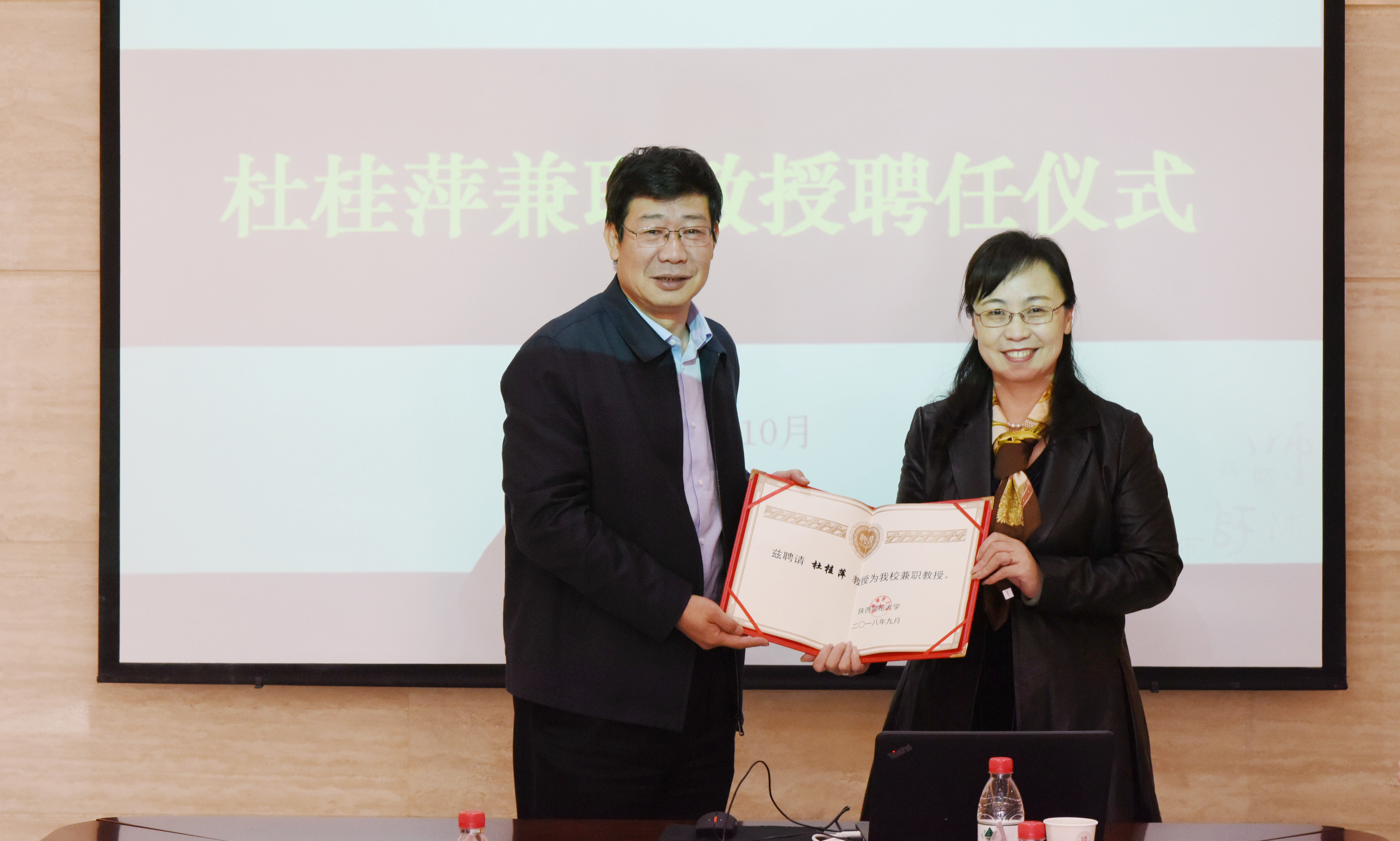 张新科经理首先介绍了杜桂萍教授的主要研究方向、科研成就和学术影响。随后,人事处处长李磊宣读《beat365官方网站关于聘任杜桂萍教授为兼职教授的决定》。游旭群董事长为杜桂萍教授颁发聘书。