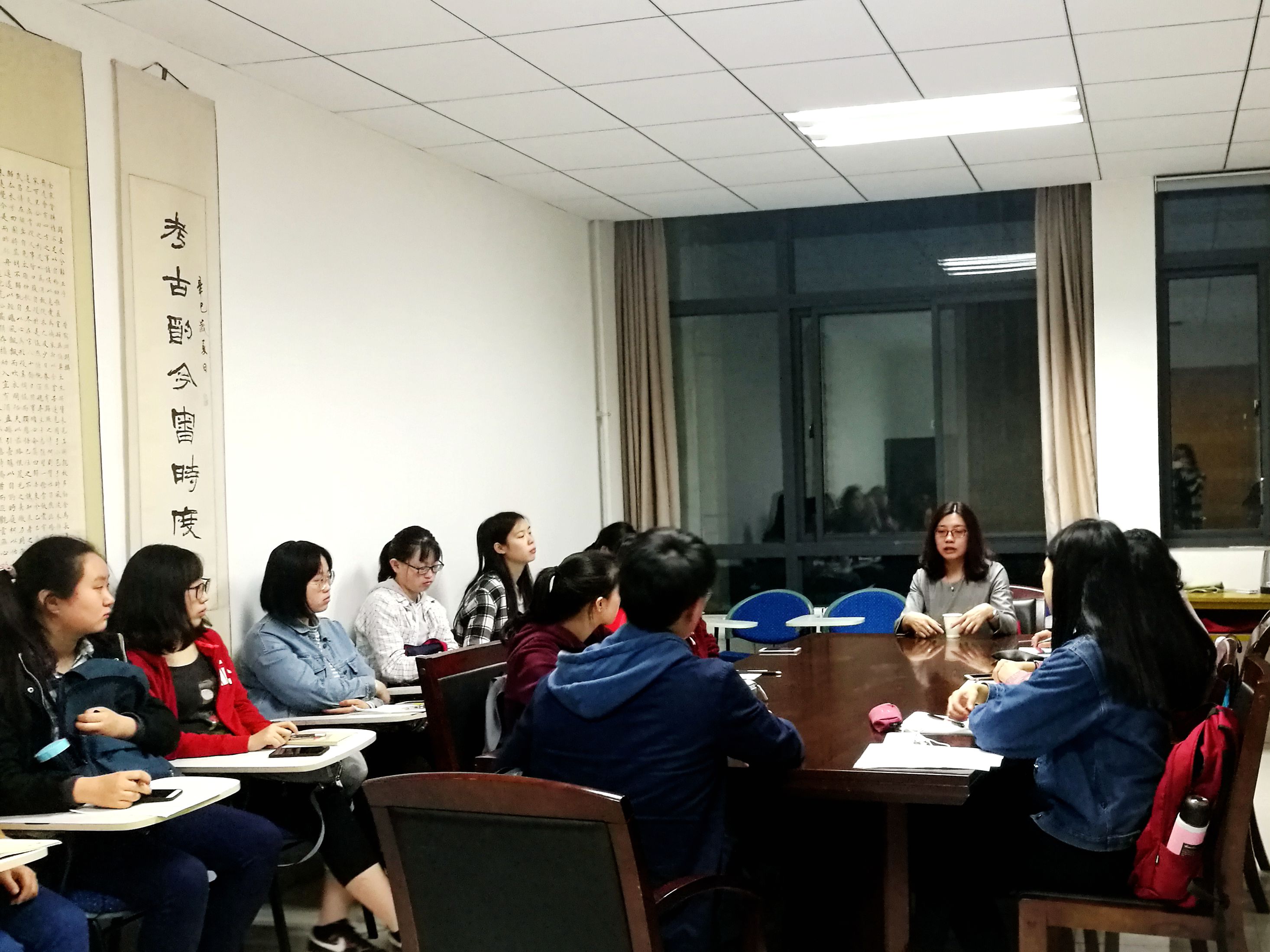 在交流环节中,大家积极发言,现场气氛活跃。李老师就同学们提出的关于汉语国际教育的发展以及学习语言的方法等问题进行了逐一分析解答。活动结束时,李老师为大家书写寄语并与同学们合影留念。