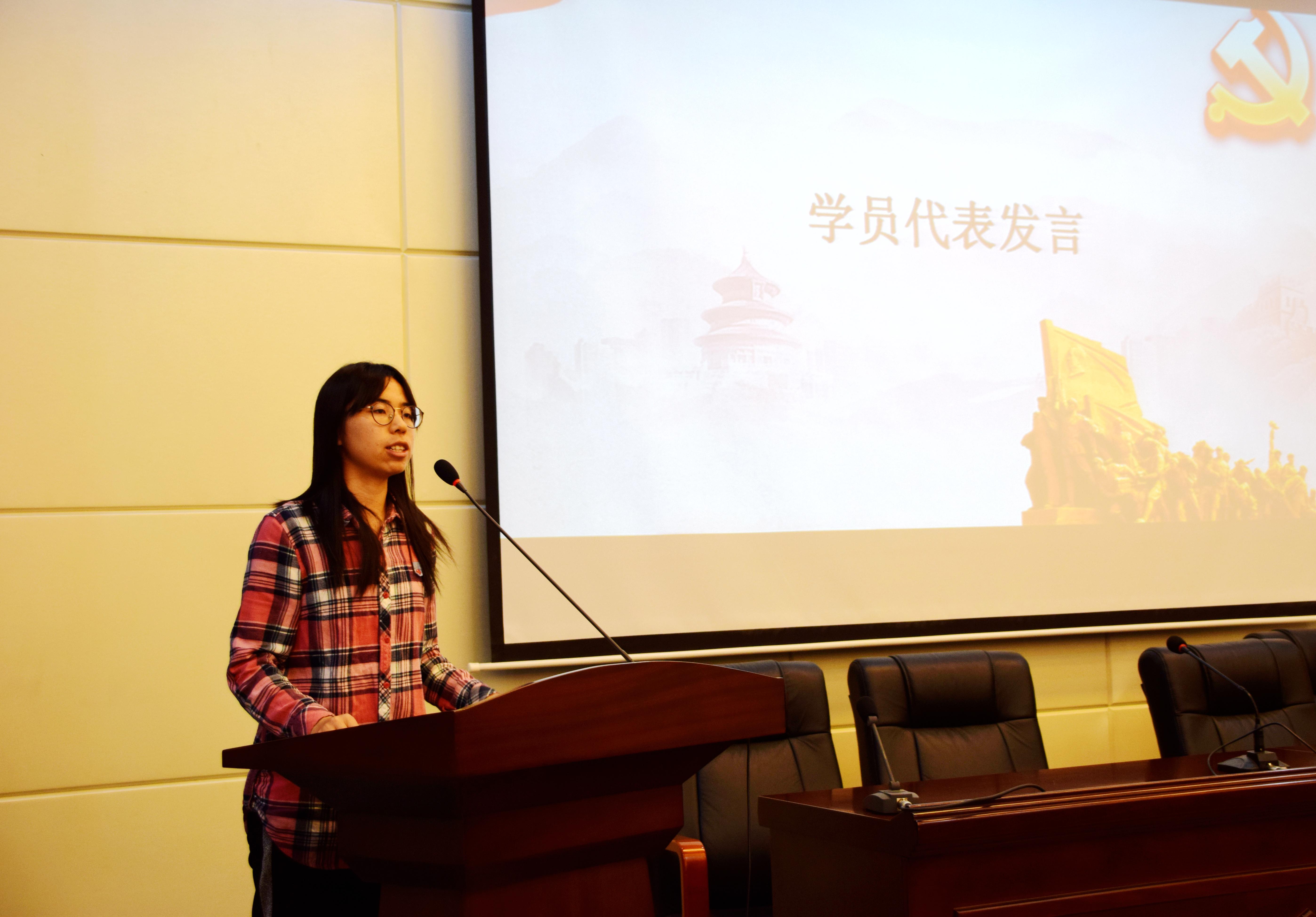 庄严的《国际歌》奏响,辛田宣读本期学员名单和分组。2016级汉语言文学卓越班韩佳萍同学作为学员代表发言,她表示要珍惜培训机会,坚定理想信念,知行合一,坚持自省,争做合格党员。李斐对培训的纪律和考勤作以要求,希望全体学员严格遵守纪律,认真听讲,做好笔记,严肃对待结业考试,坚定入党信念,切实提高党性修养。孙清潮在致辞中,对本次入党积极分子党课培训开班表示祝贺,希望同学们按照党员八条标准严格要求自己,用实际行动为党课培训交出满意的答卷。