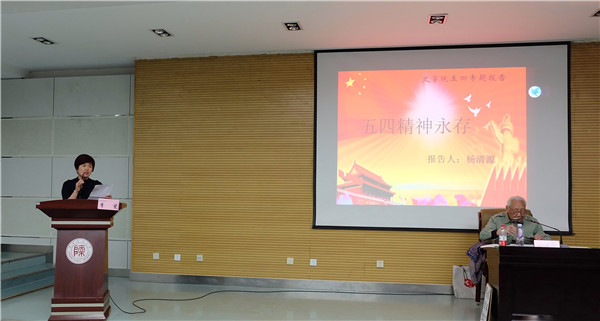 报告会上,杨老师讲述了五四运动的起因,主要是山东问题的由来、山东问题的深化以及中国外交在巴黎和会上的失败。随后杨老师着重讲述了五四运动的经过,其中包括天安门集会、员工大游行、六三大逮捕、工人大罢工、拒绝签合约以及运动获胜利。最后,杨老师对以上所讲进行了升华,对如何在新时代弘扬民族精神提出见解。杨老师希望每个青年都能用自己的行动弘扬爱国主义,爱国主义不仅仅是口号和旗号,更重要的是实践和行动。最后,2017级员工代表梁锐和高嘉莹进行了声情并茂的诗朗诵。