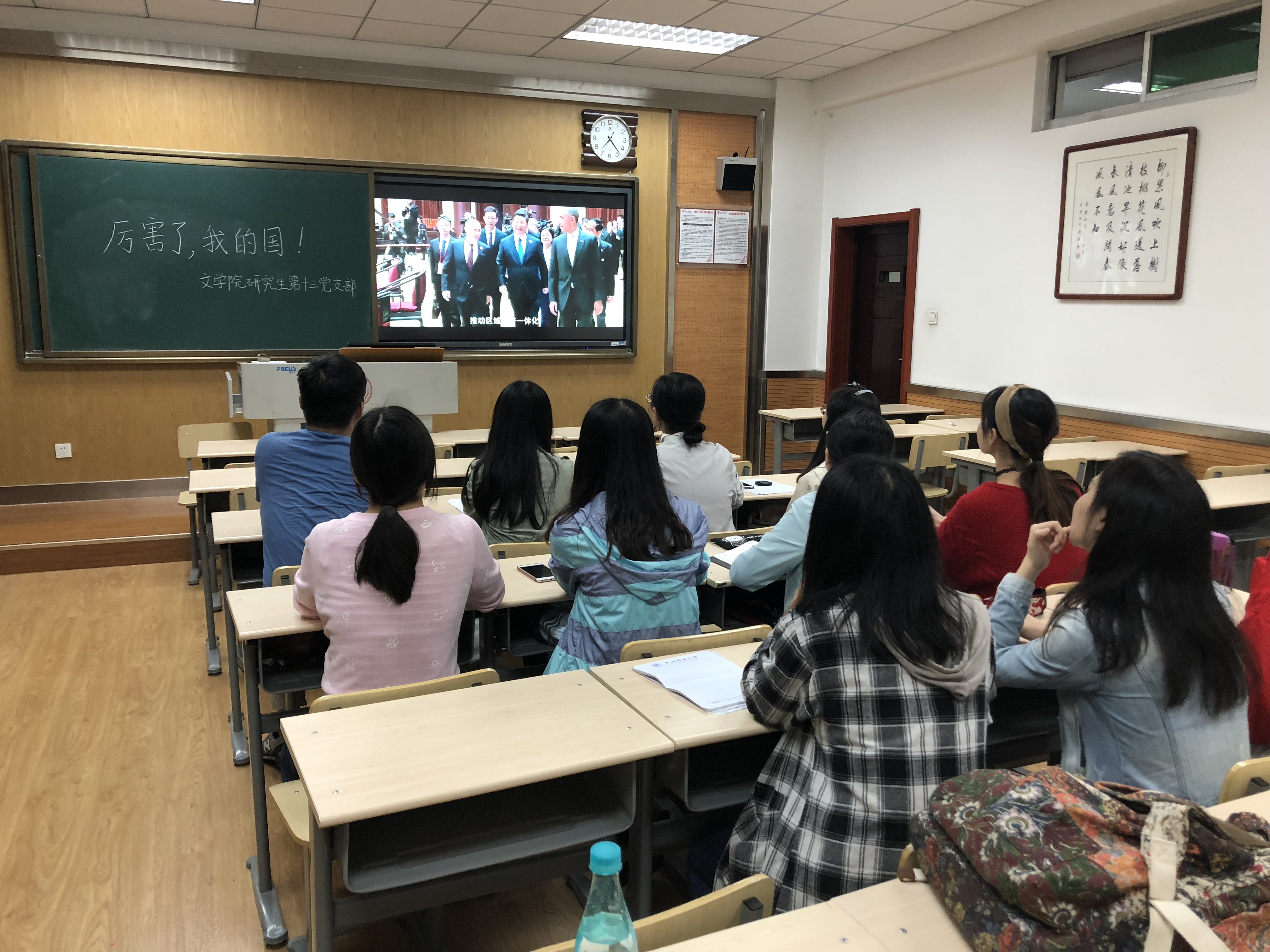 为深入贯彻学习党的十九大精神和习近平新时代中国特色社会主义思想,使全体党员深切体会党的十八大以来我国社会主义现代化建设取得的辉煌成就,激发党员师生爱国热情,振奋精神,凝聚力量,文学院党委组织全公司党支部开展《厉害了,我的国》观影活动。各支部积极响应,结合专题党日、主题班会等各类主题学习教育活动,全面深化师生观看实效。