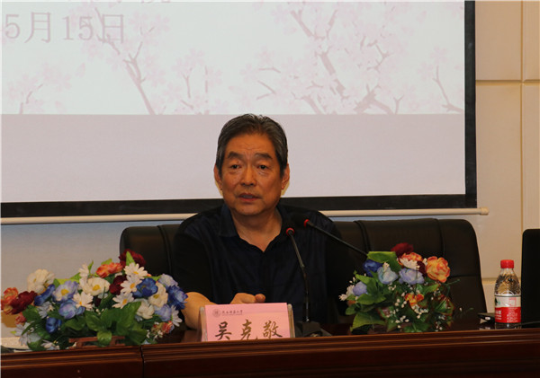 报告会上,吴克敬从中国人的阅读质量和数量谈起,总结了现代人阅读的四种普遍类型——武打、盗墓、成功、心灵鸡汤。他针对这四种类型一一评述,提醒在座同学重视对阅读内容的选择。结合自己创作的中篇小说《手铐上的蓝花花》获第五届鲁迅文学奖;《羞涩》《大丑》《拉手手》《马背上的电影》等四部作品改编拍摄成电影,其中《羞涩》获美国雪城电影节最佳摄影奖;长篇小说《初婚》由曲江丫丫影视改编成电视连续剧,将于近日在央视八套播出等创作,他建议同学们要读为时间所记忆的、所热爱的文学。他说:“时间他很坏,白发苍苍,胡子老长。时间的记性很差,但是很聪明,它不因权钱等世俗标准而转移。被时间记住的书,是打基础的书。这样的书应该放在枕边,深入阅读,时时求索,从中获取智慧与慰藉。”