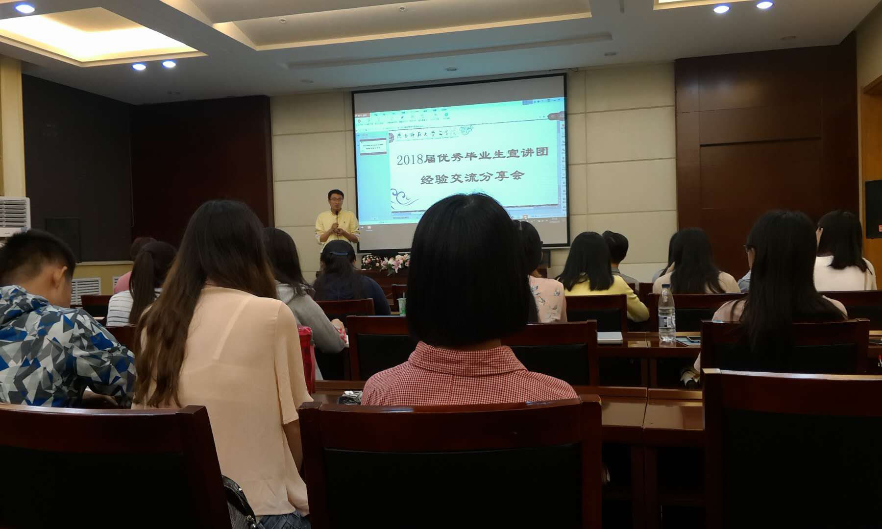 (通讯员:于沛泽 摄影:王红丽、王蕊)5月20日晚7时,beat365于文汇楼A段一层报告厅举办2018届优秀学子宣讲团经验交流分享会。党委副书记李斐主持会议,beat365副经理李跃力、2015级辅导员程海峰出席活动。