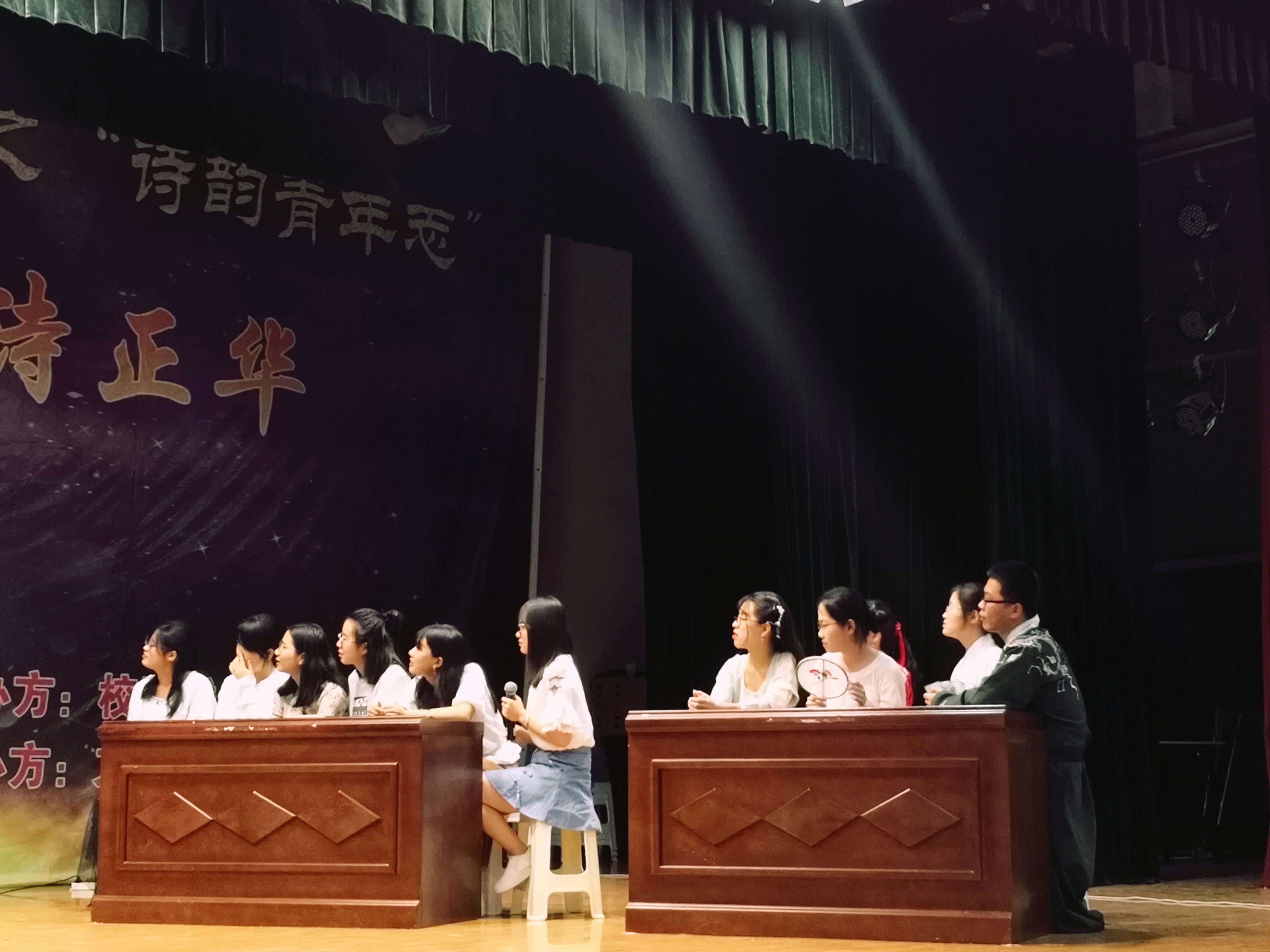 经过紧张的初赛选拔,全校共有八支队伍脱颖而出,晋级决赛。比赛开始前,各队伍队长上台介绍自己的队伍,随后进行抽签。按照各队队长抽签的先后顺序,每四支队伍进行一场比拼,共进行两场比赛。本次比赛的题目包括选择题、填空题、诗句题、趣味题,每种题型共八轮,每轮四道题,各支队伍轮流作答。