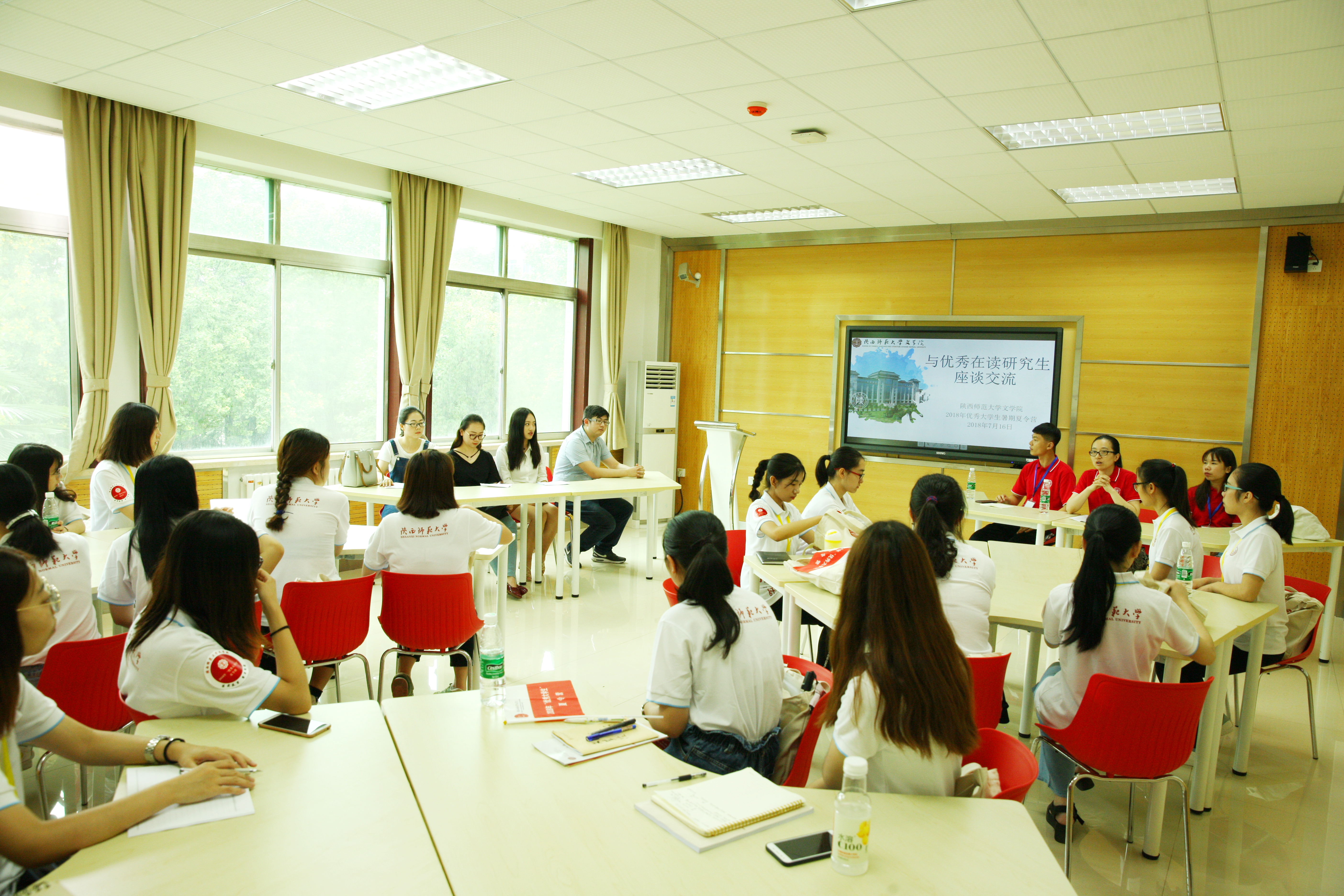 四位在读研究生讲述了自己在陕师大生活和学习的感受和体会。2016级古代文学专业的刘悦同学介绍了beat365的整体学术氛围和学术风气; 2017级古代文学专业的王旭文和现当代文学专业的黄一晨分别介绍了自己本专业的研究特色和学科魅力;从本科至研究生在beat365官方网站度过了六年的董敏同学从后勤生活、员工活动等方面分享了自己的经历和感受。