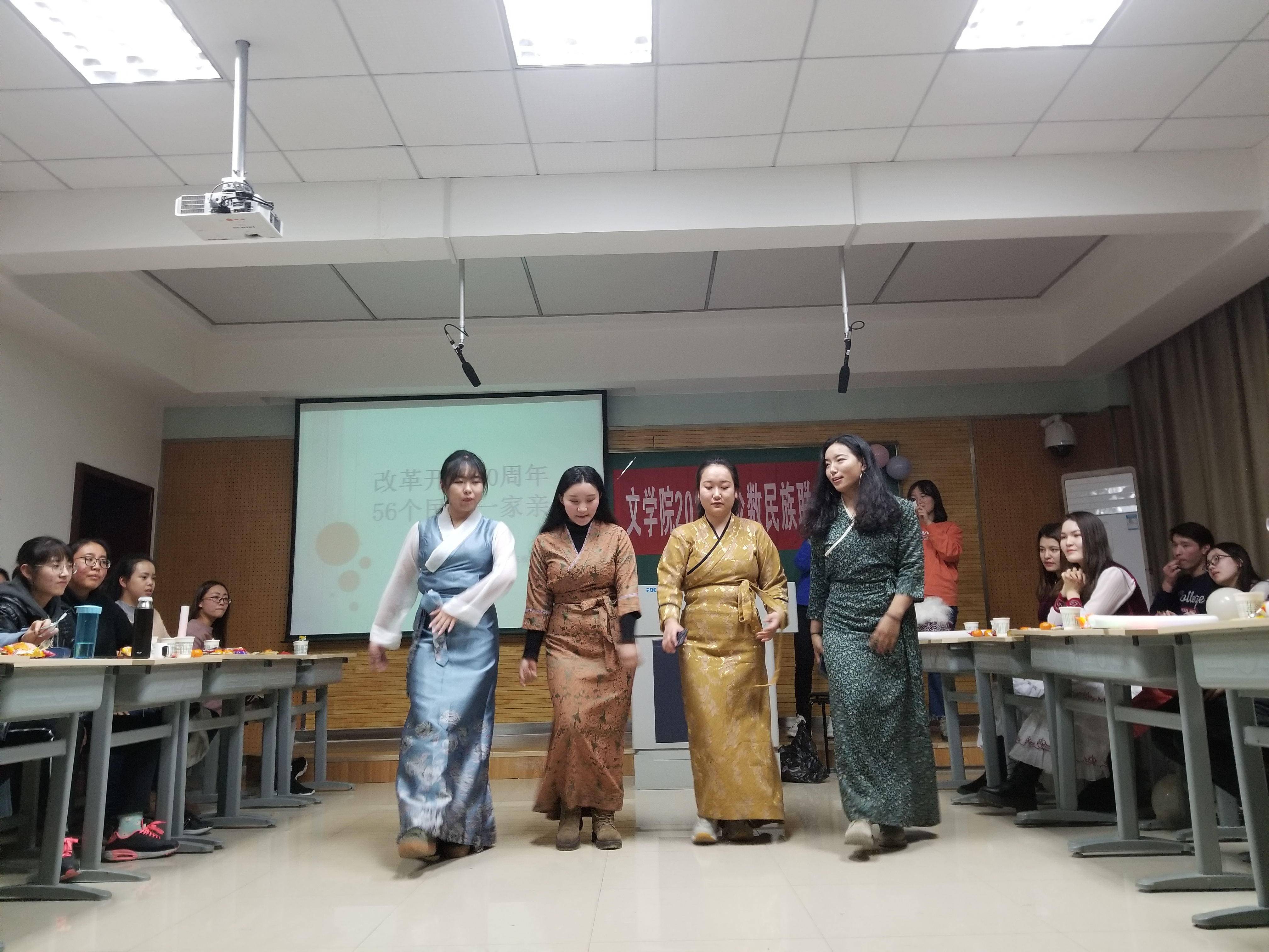 联欢会于七点正式开始,首先两名主持人邀请各民族同学进行自我介绍,每个少数民族同学都介绍了自己民族独有的文化,藏族、蒙古族和维吾尔族的同学展示了自己民族的语言。