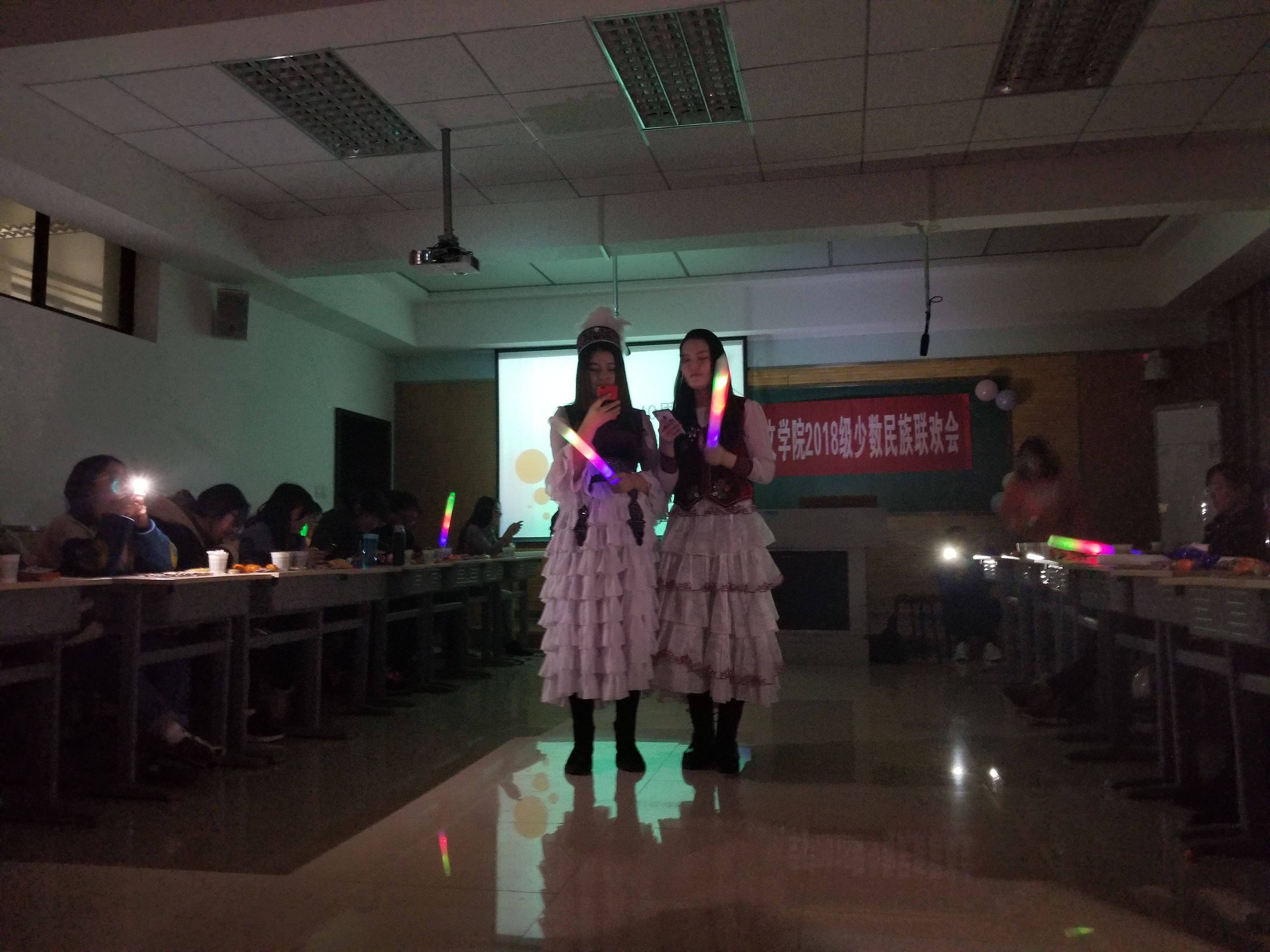 游戏结束后,少数民族同学代表为大家表演节目,真正体现了少数民族同学们的多才多艺,能歌善舞。广西的同学唱了山歌,藏族、哈萨克族、维吾尔族的姑娘小伙表演了歌舞,同学们举起了手中的荧光棒为精彩的节目助兴,《日不落》《暖暖》《突然想起你》都成为了当晚热曲。王秋婷老师为大家表演了《海草舞》,成功将气氛引向了高潮。