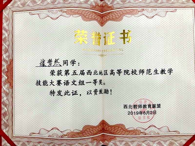 (通讯员:李军亮)5月31日至6月2日,第五届西北地区高等院校师范生教学技能大赛在陕西咸阳举办,公司2016级汉语言文学(师范)专业璩梦然同学代表公司参加了比赛,并荣获语文组一等奖。一等奖为比赛最高奖项,每学科仅有2名选手获得。