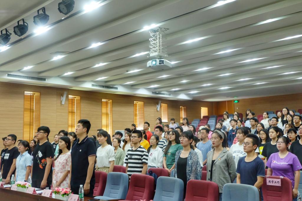 全体起立奏唱共青团团歌。辛田老师宣读《关于发放2018-2019学年beat365员工会和先进个人聘书的决定》,侯立老师宣读《关于发放2018-2019研究生会和先进个人聘书的决定》,范虹鹭老师宣读了《关于发放2018-2019学年宿舍管理委员会聘书的决定》以及《关于表彰2019年“颂文苑雅懿,歌青春华章”迎新晚会中的先进个人的决定》,程海峰老师宣读了《关于表彰了团学工作、社团工作中的先进集体和先进个人以及2019年“戏·韵”话剧节优秀剧组及演职人员的决定》,王秋婷老师宣读了《关于表彰本科生优秀笔记征集活动中的先进个人的决定》。与会老师为获奖集体及个人颁奖。