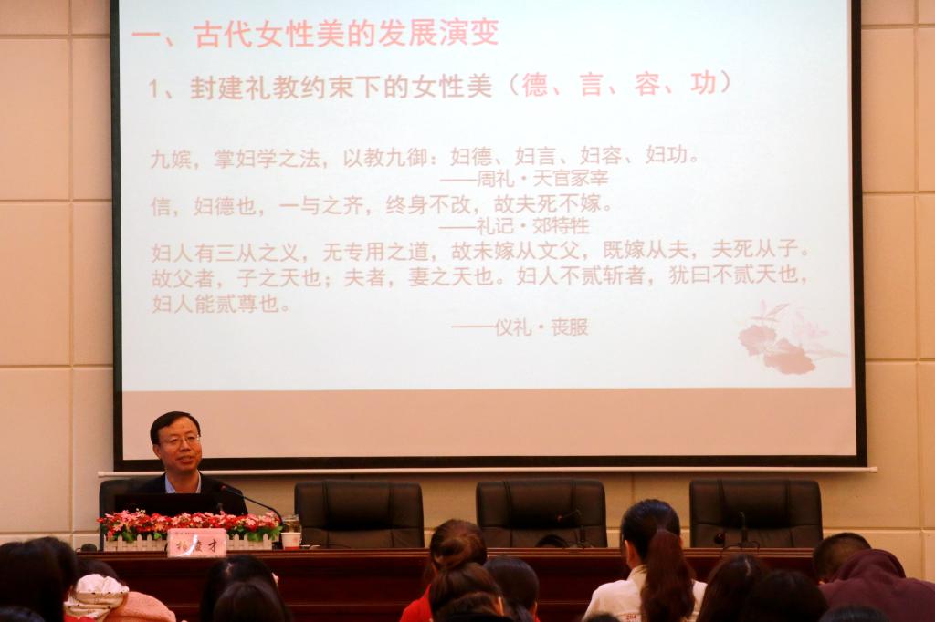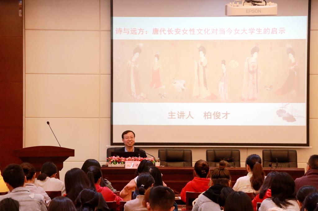 柏俊才老师从封建礼教约束下的女性美和文人笔下女性美讲起,旁征博引,从不同角度展现了中国古代女性的风采。他以唐代长安女性的不同妆容、装饰为例,表示唐代女性的身体与服装的审美特征,与唐代社会丰富的物质生活、宽松的思想文化氛围和唐朝大气开放的外交政策有着密不可分的联系。随后,柏老师通过武则天、上官婉儿、玉真公主和鱼玄机四位传奇女性的对比,讲述了在不同时期下唐代长安女性的人生经历,并借此启示当代女老员工要更加注重内在精神的培养和自身学识的提高。诗与远方实质是指才华和梦想,而才华与理想才是硬道理。他希望同学们以前人为鉴,内外兼修,以才华立足,积极参与社会活动,广交诤友益友,丰富自己的精神气质。