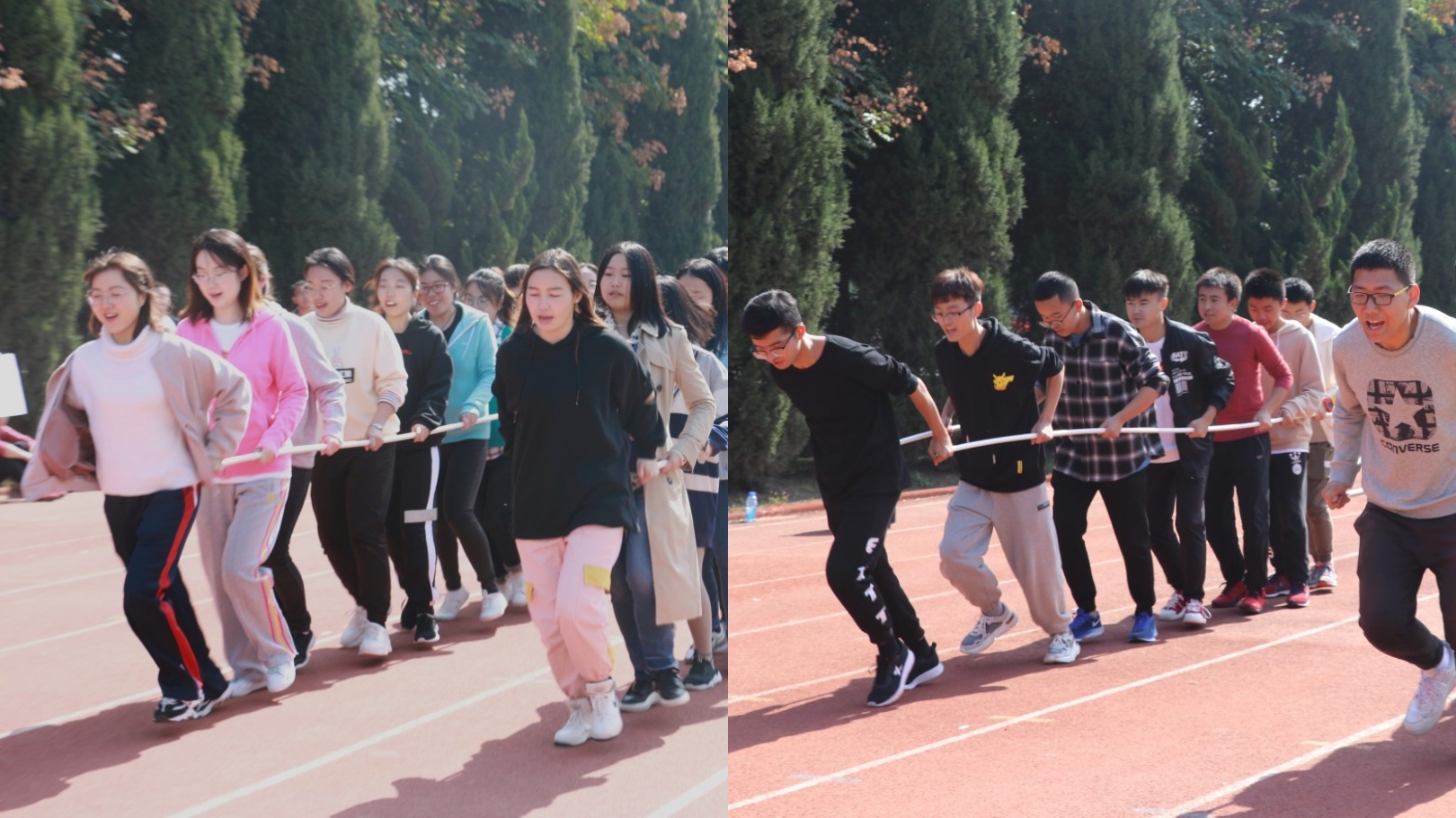 拔河比赛,队员们紧握麻绳,迸发力量;亲友团齐声呐喊,助威加油。