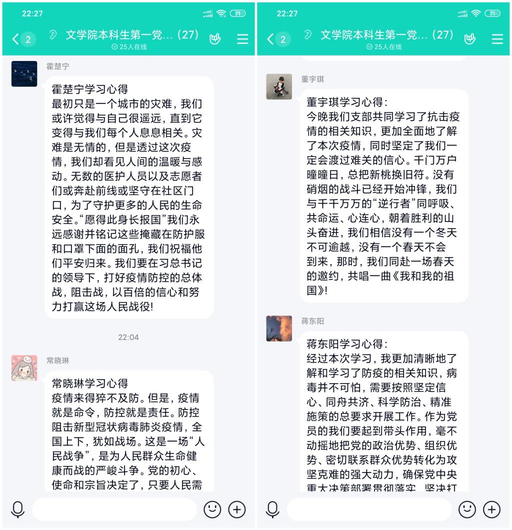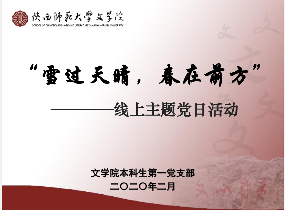 (通讯员:文苑)为深入贯彻落实习近平总书记关于疫情防控工作重要讲话和重要指示批示精神,充分发挥基层党组织战斗堡垒作用和党员先锋模范作用,2020年2月25日,beat365本科生第一党支部召开了“雪过天晴,春在前方”线上主题党日活动。活动由党支部书记尚梦帆主持。