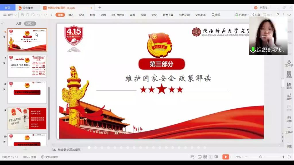 员工会组织部李雅婧带领同学们一同收看了视频《国泰民安》,进一步了解总体国家安全观。国家安全观是对国家安全现实的反映。人人关心国家安全,人人都是“总体国家安全观”的践行者。罗琼对维护国家安全政策作了细致解读。国家安全包括生活的方方面面,国家安全的宗旨就是人民安全。