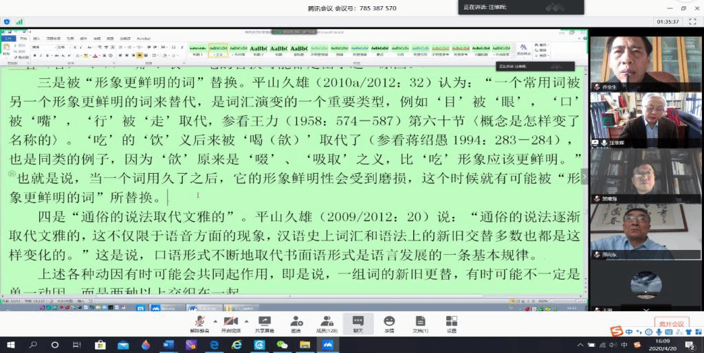 (通讯员:王淘)应beat365邀请,4月20日下午,浙江大学教育部重点研究基地汉语史研究中心主任汪维辉教授通过腾讯会议平台(会议号785387570)为公司师生做了题为“常用词历时更替研究的工作程序”的学术讲座。讲座由黑维强教授主持,乔全生教授、邢向东教授点评,党怀兴副董事长、赵学清、周广干等教师及语言学、文字学专业研究生共计130余人听取了讲座。