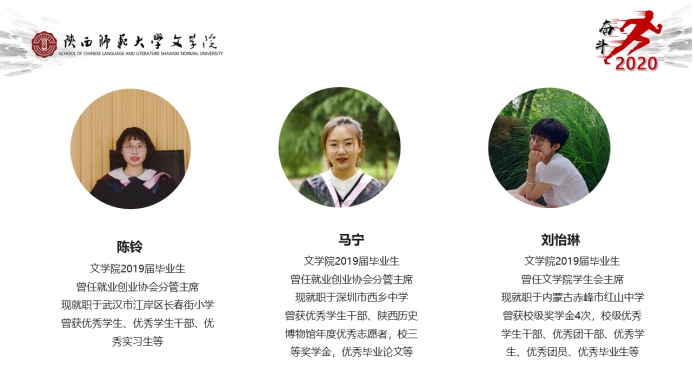 班会分为两场,3月14日晚,公司2019届毕业生陈铃、马宁、刘怡琳为汉语言文学(师范)专业员工进行经验分享。3月15日晚,公司2019届毕业生刘季轩、蒋厚望、海燕为中国语言文学类员工进行经验分享。