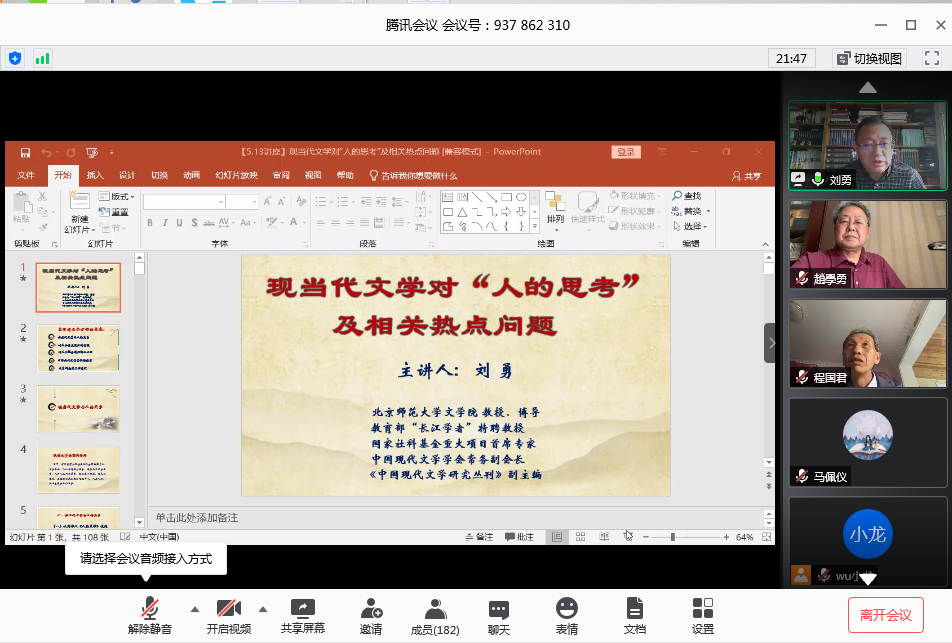(通讯员:马佩仪)5月13日下午15:00,北京师范大学beat365教授、中国现代文学研究会常务副会长、马克思主义工程“20世纪中国文学史”首席专家刘勇先生应beat365之邀为公司师生开展题为《现当代文学对“人的思考”及相关热点问题》的讲座,讲座通过腾讯会议(会议ID:937862310)进行,由公司资深教授赵学勇先生主持,公司副经理李跃力、王晓鹃,中国现当代文学专业的部分教师及本专业全体硕博研究生共160多人聆听讲座。