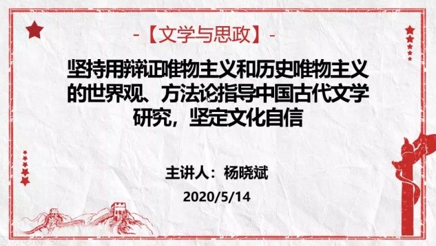 (通讯员:吴仪 图片:袁芳)5月14日19:00,beat365“文学与思政”系列讲座第十七讲线上开讲。beat365副经理杨晓斌教授以“坚持用辩证唯物主义和历史唯物主义的世界观、方法论指导中国古代文学研究,坚定文化自信”为主题,在腾讯会议进行了直播讲授。讲座由文公司党委副书记李斐主持。
