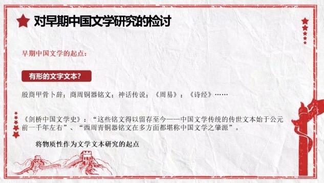 在本次“文学与思政”讲座中,杨晓斌老师为我们讲解了早期中国文学未有文字,先有文学的现象。屈原否定论的检讨等内容,早期的中国文明可谓是是满天星斗,多元共存的文学,党的十九大提出“中国特色社会主义文化,源自于中华民族五千多年文明历史所孕育的中华优秀传统文化”。因此,要坚持唯物主义观,坚实推进对早期文化的认识,这对进一步提升文化自信是十分重要的。