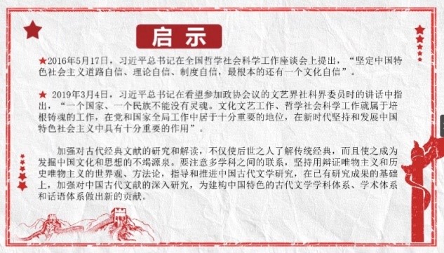 在杨晓斌老师的谆谆教诲下,我更深刻的理解了我们要坚持用辩证唯物主义和历史唯物主义的世界观和方法论来看待文学的意义所在。其中关于“疑古”思潮部分的讨论更使我对所谓文化自信有了较为正确的认识。“欲人勿疑,必先自信”,“文化自信”绝不仅仅是一句口号。只有对自己的文化有坚定的信心,才能获得坚持坚守的从容,鼓起奋发进取的勇气,焕发创新创造的活力。