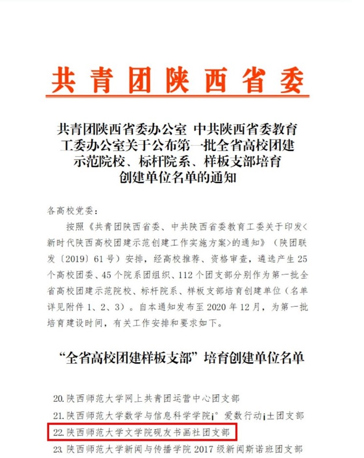 (通讯员:文苑)近日,在共青团陕西省委、中共陕西省委教育工委公布的第一批全省高校团建标杆院系和样板支部培育创建名单中,公司砚友书画社团支部入选“全省高校团建样板支部”培育创建单位名单。这是公司基层团组织建设工作取得的又一佳绩。