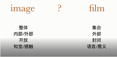 在德勒兹看来,影像是个整体,并且是运动着的,不能够被再现,它既是内部的也是外部的,它是开放的,从知觉进入到人们的感触;电影是将整体进行分割提取,再集合起来的产物,是可以被外化的事物,它是封闭的,从符号学来讲它成为了语言并从而转化为意义。它们是两个完全不同的范畴。后来诸多哲学家关于影像的思想也都没有逃脱影像与精神的维度。虽然德勒兹虽然在书中坚持说他的思想源自于柏格森的《物质与记忆》(Matter and Memory, 2013),但他强调说他的书是对心理学危机的一个诊断,暗指19世纪末科学心理学的建立为哲学心理学所带来的危机。