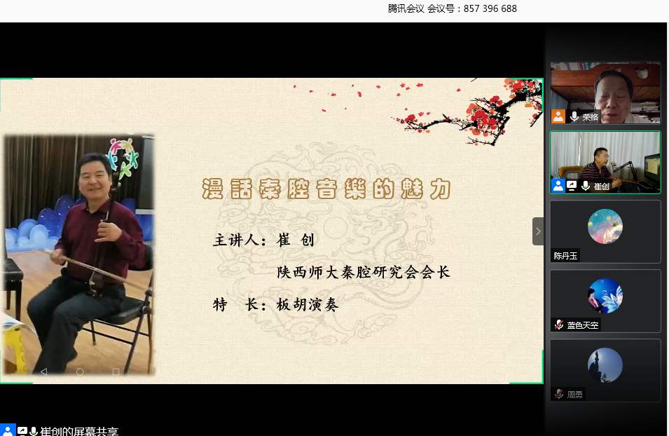 (通讯员:陈丹玉)6月12日上午10点至12点,公司教育部中华优秀传统文化基地系列讲座邀请公司秦腔研究会会长、陕西省戏曲研究院特聘教师崔创做客腾讯会议平台,线上精彩讲述《秦腔音乐的魅力》。讲座由公司beat365高益荣教授主持,校内外四十余位对传统文化感兴趣的观众在线观看。