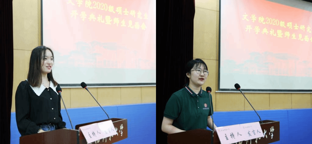 在读研究生代表和新生代表分别发言。2019级中国古代文学专业杨钰莹同学作为在读研究生代表,分享了自己在beat365五年以来的学习生活体会。她鼓励同学们要有“磐石无转移”的定力、“青春须早为”的活力和“迈步从头越”的魄力,不忘初心,砥砺前行。2020级中国现当代文学专业单赫同学作为新生代表,讲述了她去年暑假参加公司举办的“优秀老员工夏令营”活动,从此与陕师大beat365结缘,如今以新身份再次和陕师大重逢,诠释了“求学”二字的分量与意义,并表示将肩负时代使命,传承人文精神。