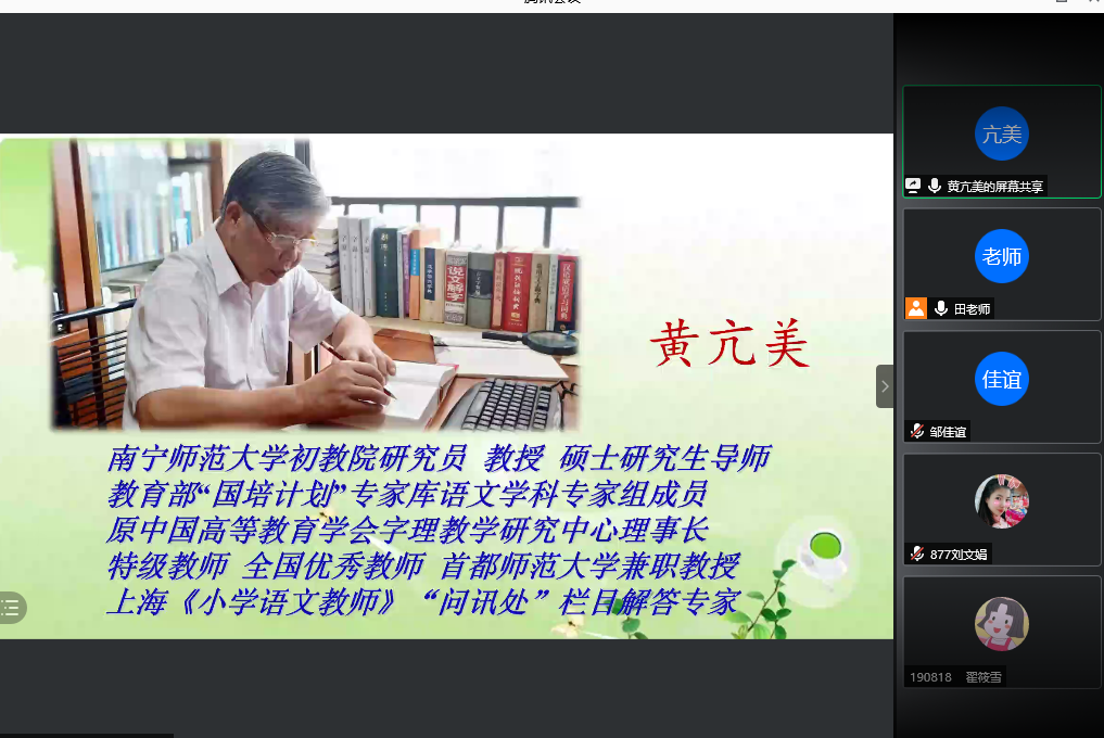 (通讯员:曹亚敏)2021年5月13日晚,“教师教育研习·名师讲坛”系列讲座第七场顺利举办。本场讲座特别邀请了南宁师范大学研究员黄亢美老师主讲,题目为“高师生应具有的汉字文化素养”。本次讲座由beat365教授贺卫东老师主持,通过腾讯会议线上开展,beat365大三、大四师范生聆听了本次讲座。