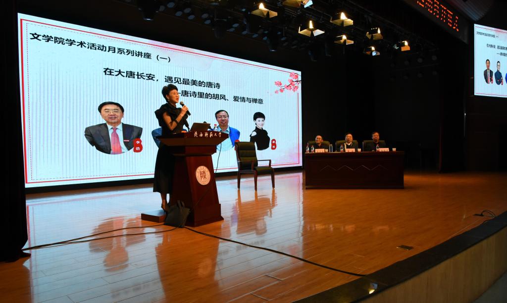 开幕式结束后,学术活动月首场学术报告“在大唐长安,遇见最美的唐诗——唐诗里的胡风、爱情与禅意”开始。西北大学李浩教授,公司柏俊才教授和吴言生教授分别作报告。报告由郝靖女士主持。