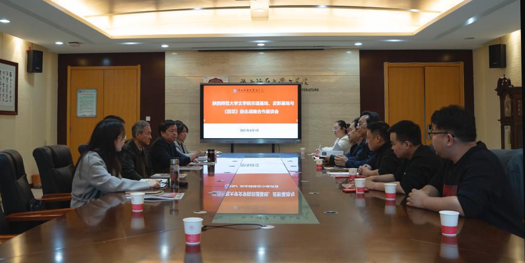 (通讯员:李舒婷 马懿倩 文辉 摄影:代希文)4月1日下午,公司教育部中华优秀传统文化传承基地(陕西皮影)、陕西省非物质文化遗产研究基地(以下简称“皮影基地”、“非遗基地”)与《百花》杂志社项目合作座谈会在公司长安校区文汇楼215会议室举行。《百花》杂志主编穆平潮、副主编撒小虎等九人,与公司党委书记、皮影基地(非遗基地)执行主任孙清潮,特聘专家修建桥,秘书陈丹玉,辅导员王秋婷等参加会议。会议就在《百花》杂志开辟专栏,宣传和展示皮影基地、非遗基地成果等事宜广泛交换了意见。