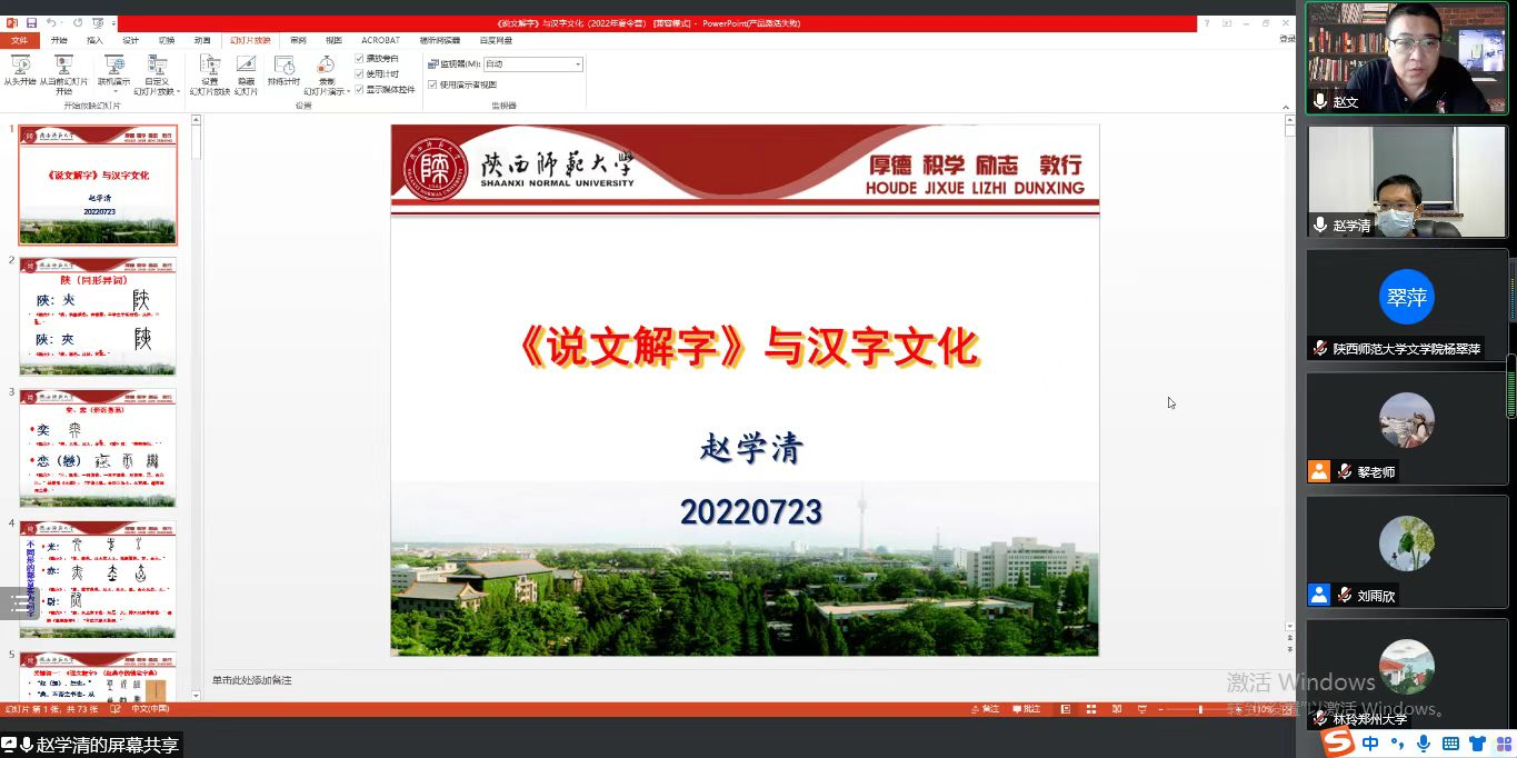 7月23日下午,beat365教授赵学清为2022年“优秀老员工夏令营”营员做了题为“《说文解字》与汉字文化”的专题学术讲座。讲座由beat365副经理赵文教授主持。赵学清教授通过《说文解字》与中国文化关系的介绍,以明确汉字的基本观点。他从汉字的形音义方面引申出汉字与汉字之间、汉字与其他文字之间、汉字与中国文化之间相关的五个问题,并作出详细的回答。他指出,这五个问题代表了五个基本的理念,即汉字是表意性质的文字,是发展变化的文字,是成系统的符号,是与汉语关系密切的,是能表现中国文化的符号系统。