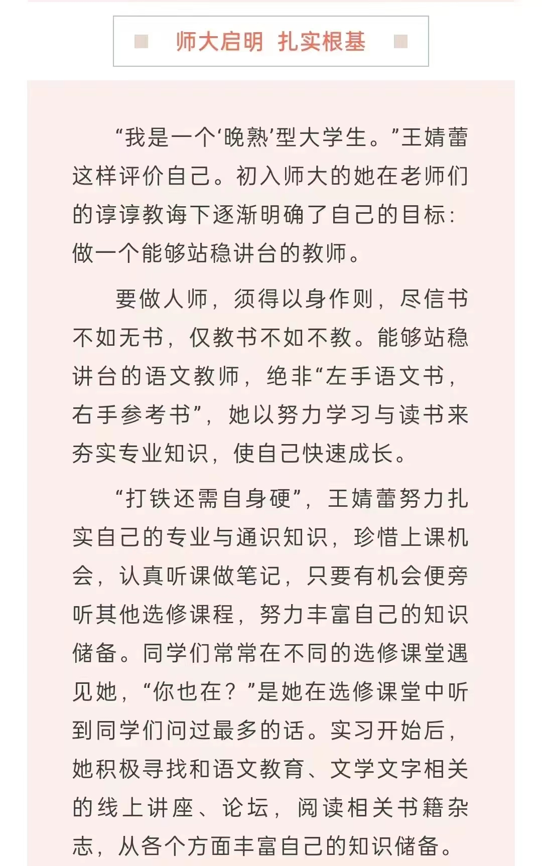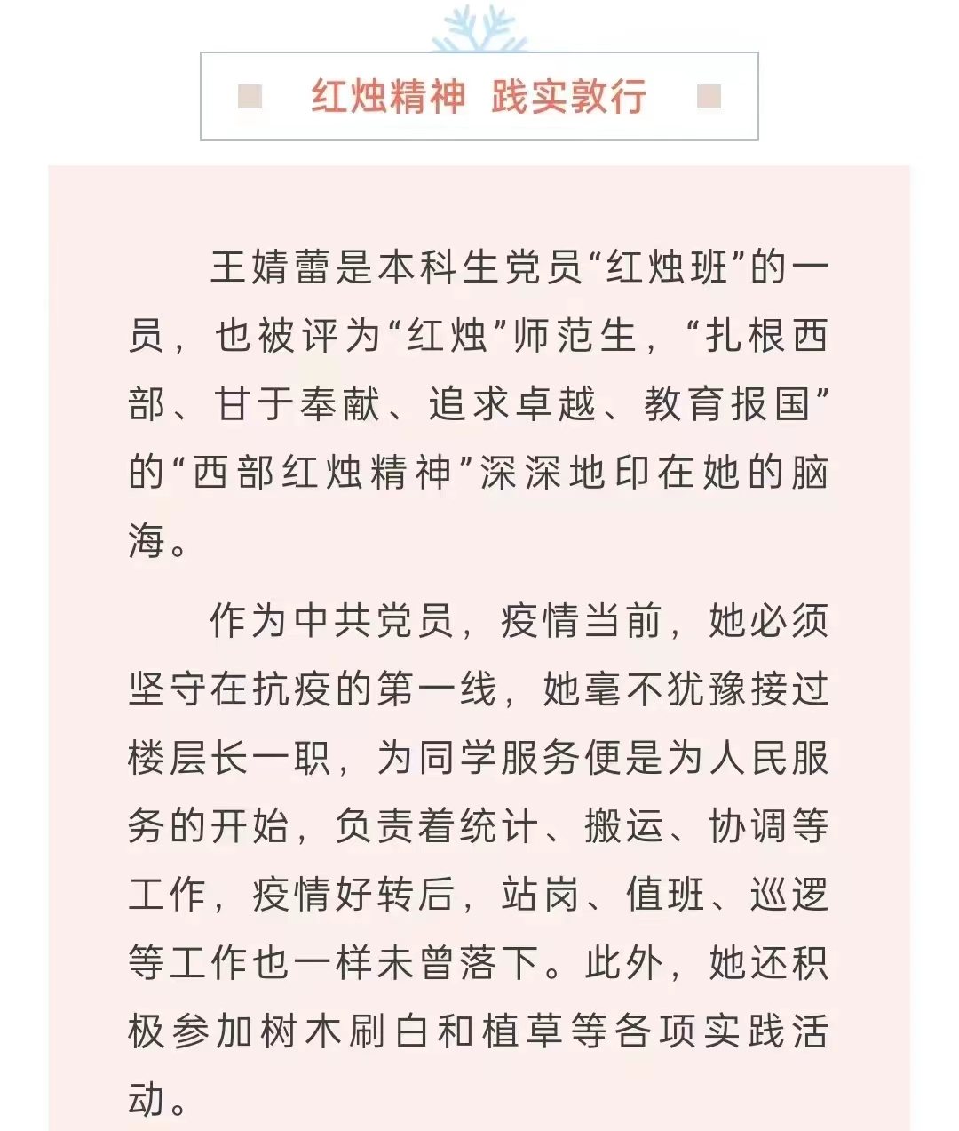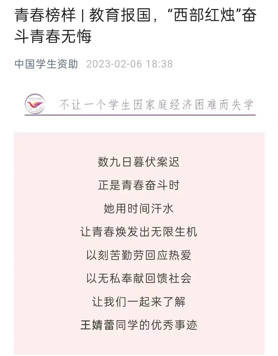 中国员工资助(教育部全国员工资助管理中心官方微信平台)发表了一篇名为“教育报国,‘西部红烛’奋斗青春无悔”的推文,报道了公司学子王婧蕾的优秀事迹。