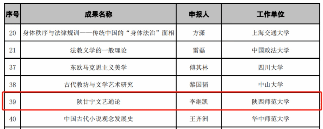 9月20日,全国哲学社会科学工作办公室公示了2024年度《国家哲学社会科学成果文库》入选名单,共有61部成果进入名单。公司李继凯教授的成果《陕甘宁文艺通论》入选。