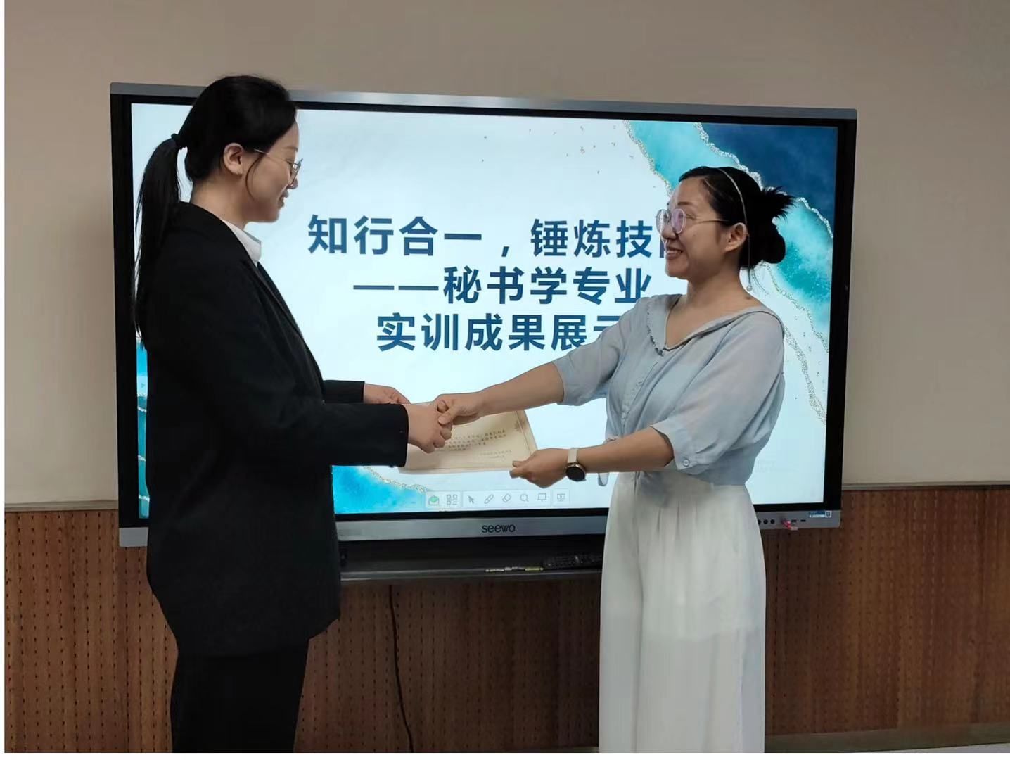 在本次实训成果展示活动中,同学们自由组合成10个小组,分别从秘书礼仪、会议与活动方案、秘书工作情景剧以及座谈交流会等方面进行了展示。