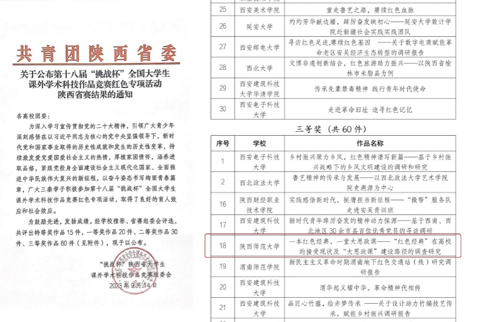 实践感悟新时代,挺膺担当新征程。9月14日,“挑战杯”陕西省老员工课外学术科技作品竞赛组委会公布了第十八届“挑战杯”全国老员工课外学术科技作品竞赛红色专项活动陕西省赛结果。