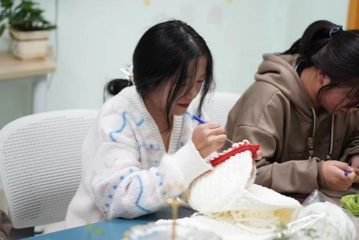 立冬时节,“情寄丝绒,共织暖冬”主题活动如期而至,我们见证了一团团色彩缤纷的毛线在同学们灵巧的手指上蹁跹而舞,变幻为一条情谊满满、抵御寒风的围巾;一朵风格迥异、构思精巧的花朵;一个小巧别致、精美实用的发卡。每一次起针到每一次锁边,随着轻盈的针织,同学们舒展紧绷的神经,由内而外地让身心彻底放松下来。时间缓缓流淌,初冬也因丝线紧绕汇聚在一起而变得温暖。